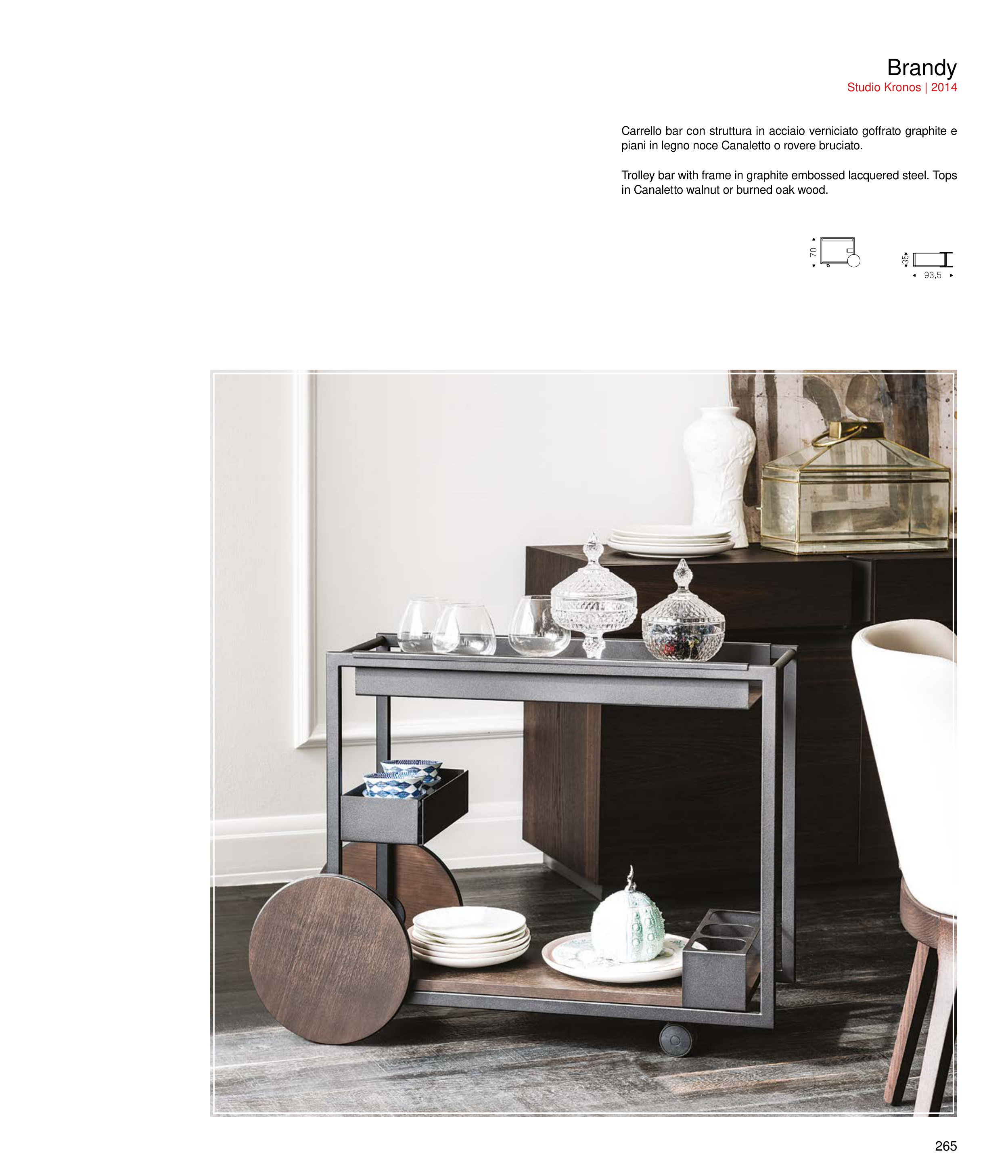 Trolley bar with frame in graphite embossed lacquered steel. Tops
