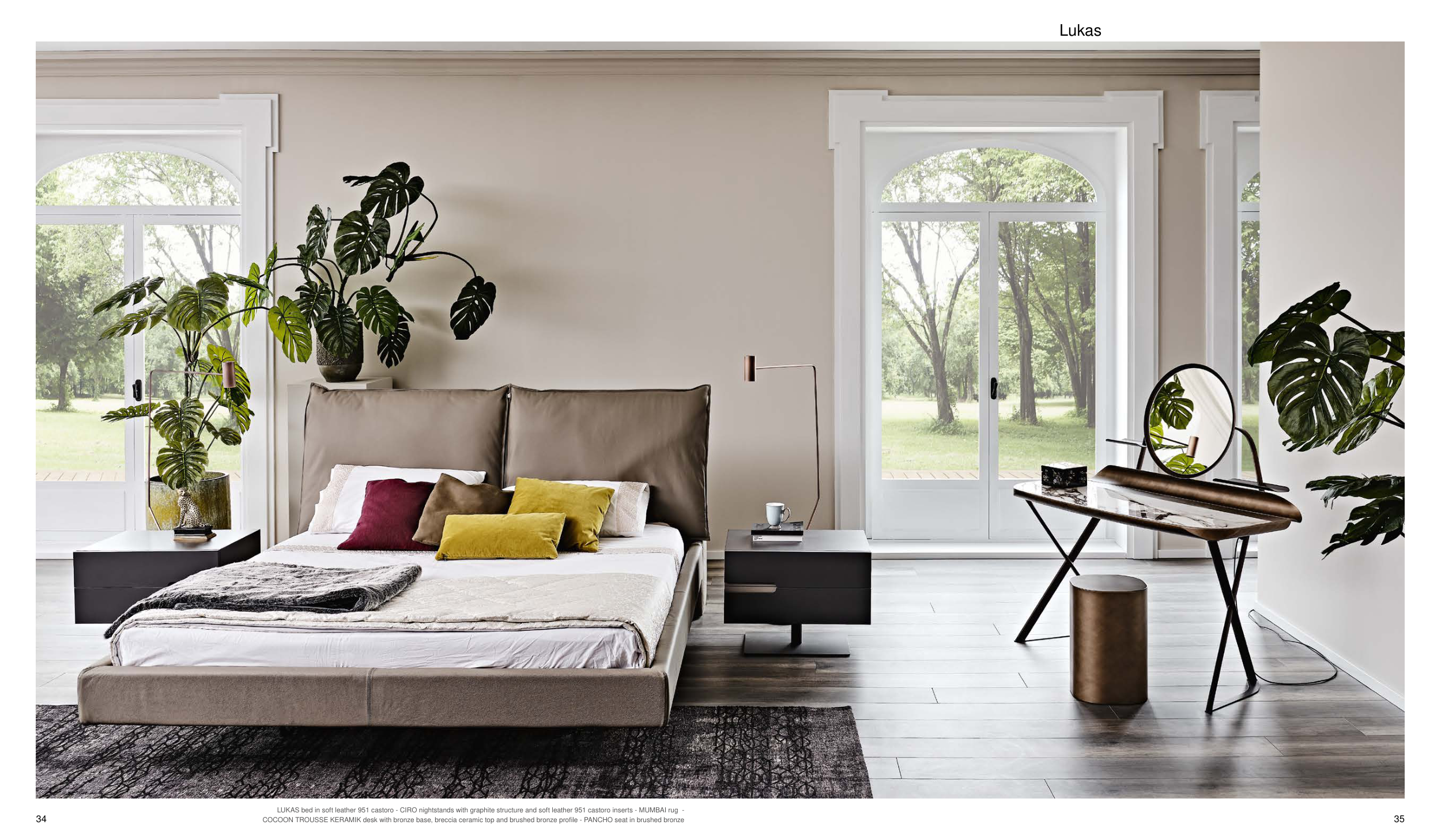 LUKAS bed in soft leather 951 castoro - CIRO nightstands with graphite structure and soft leather 951 castoro inserts - MUMBAI rug -