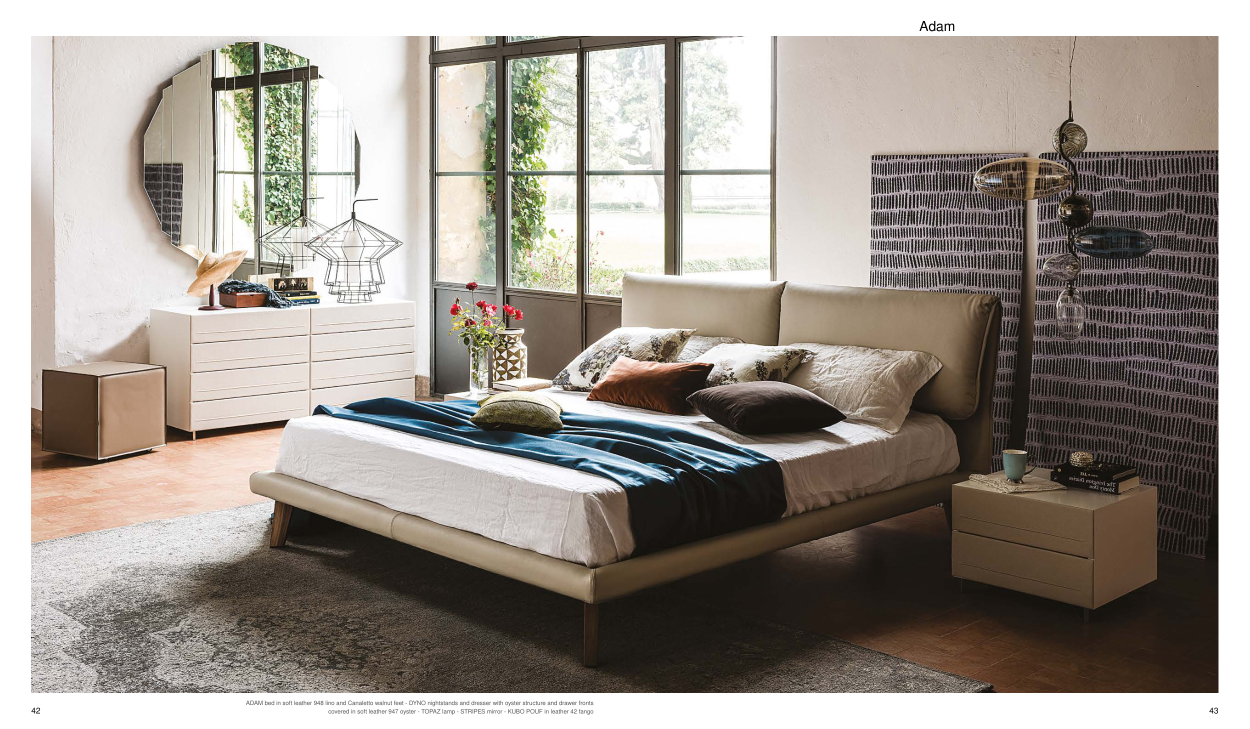 ADAM bed in soft leather 948 lino and Canaletto walnut feet - DYNO nightstands and dresser with oyster structure and drawer fronts