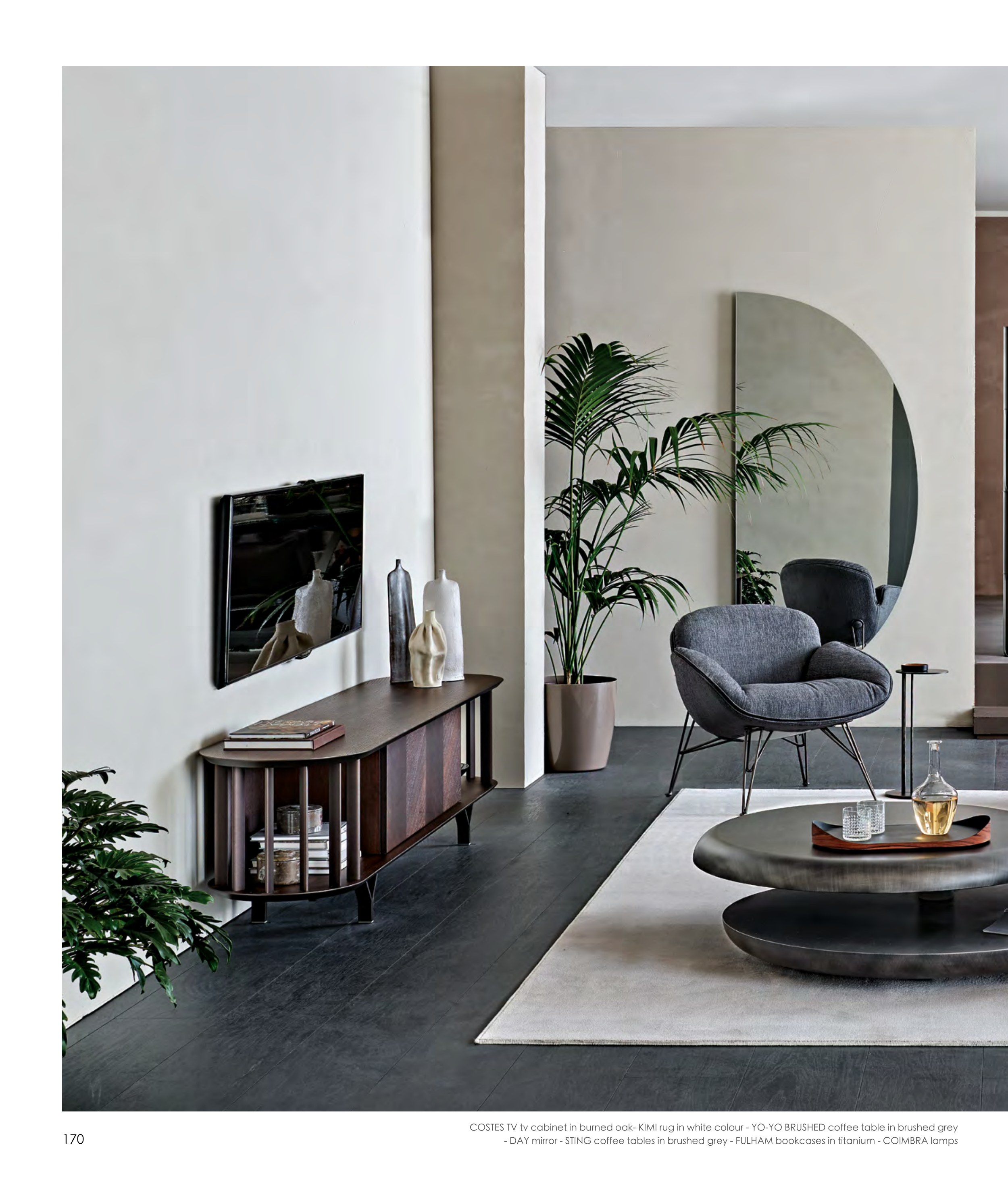 - DAY mirror - STING coffee tables in brushed grey - FULHAM bookcases in titanium - COIMBRA lamps