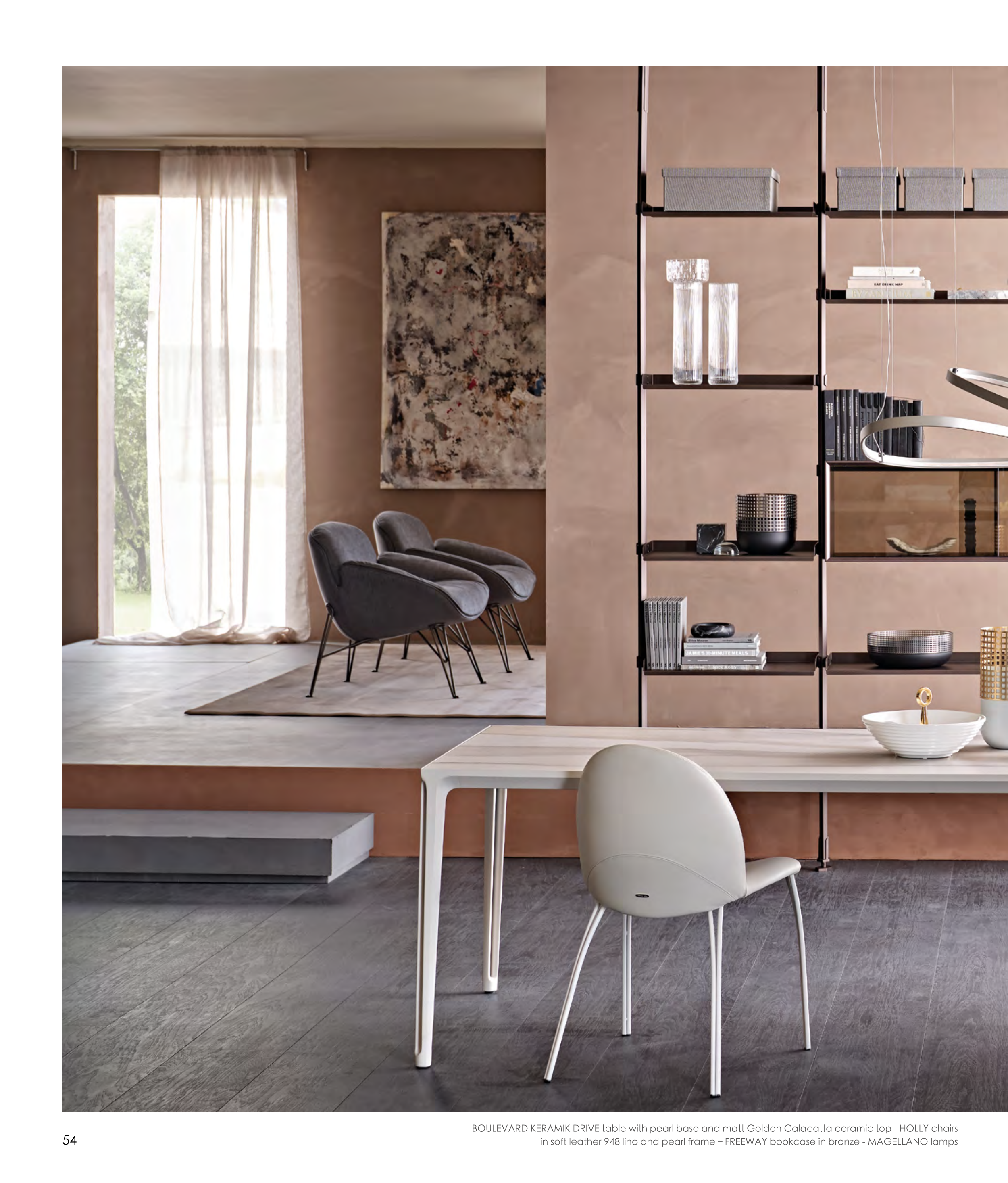 in soft leather 948 lino and pearl frame – FREEWAY bookcase in bronze - MAGELLANO lamps