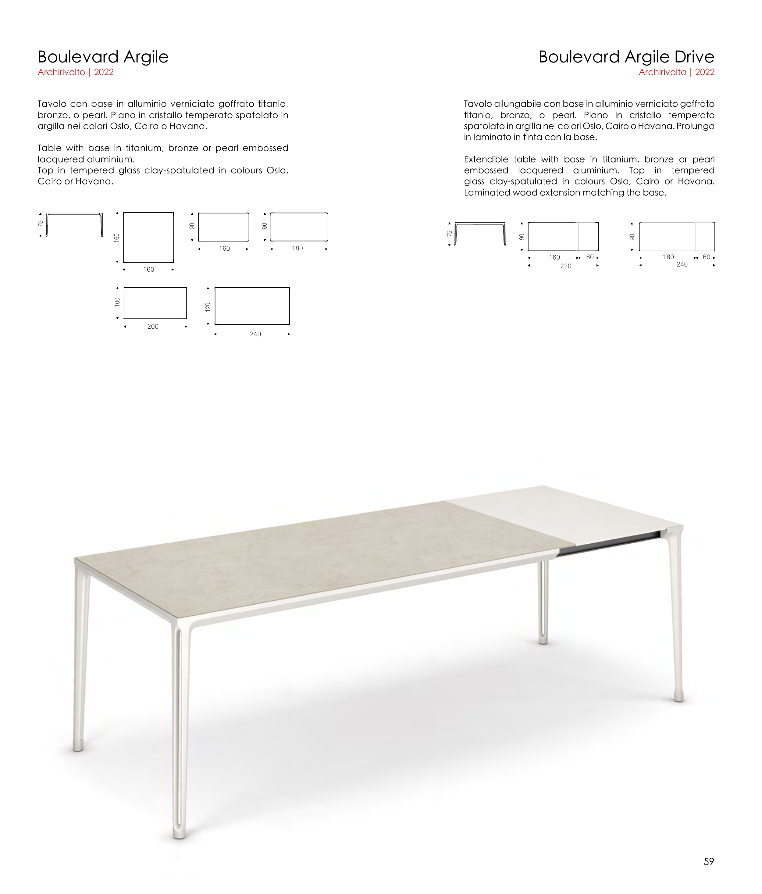 Extendible table with base in titanium, bronze or pearl