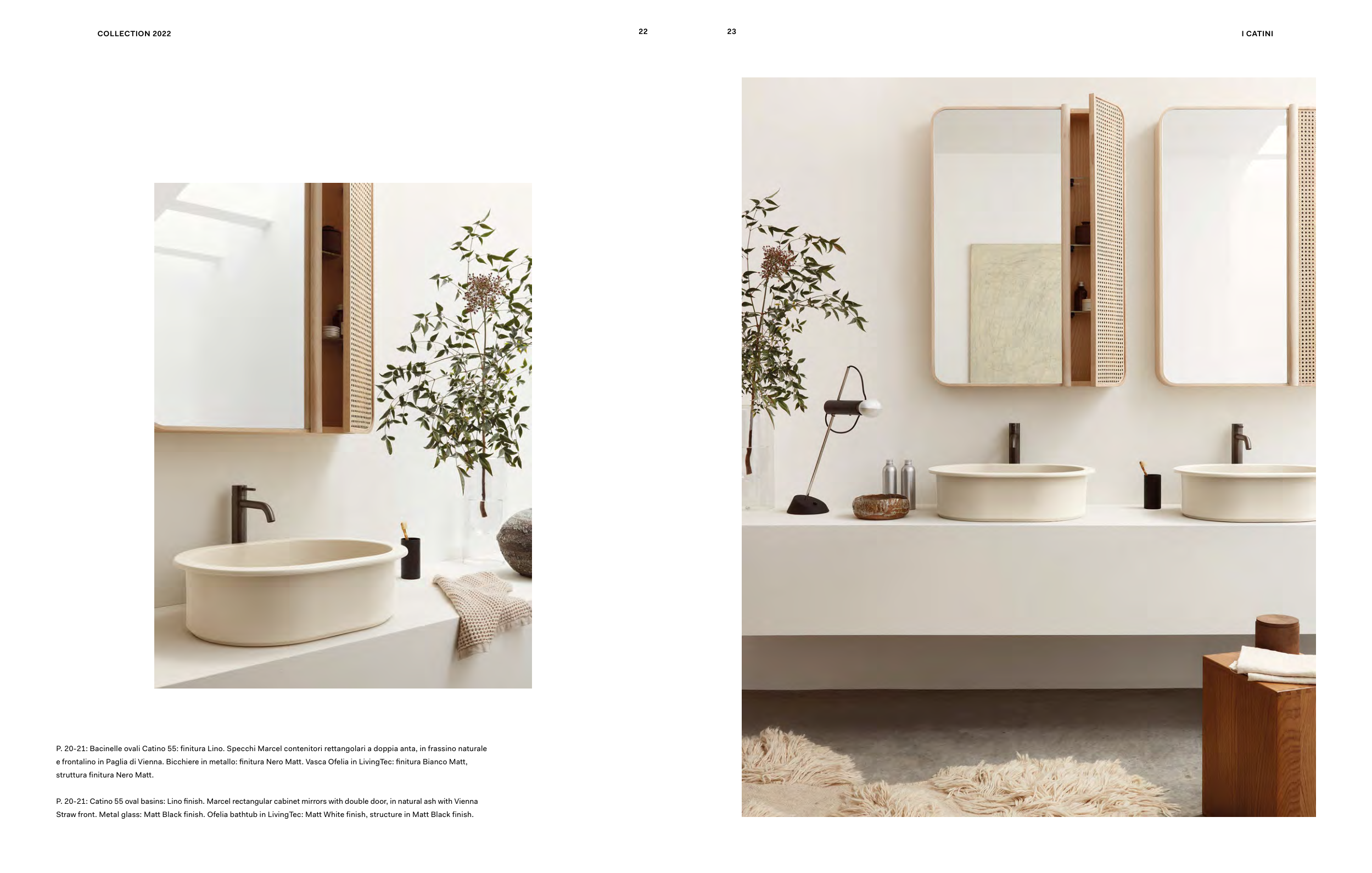 P. 20-21: Catino 55 oval basins: Lino finish. Marcel rectangular cabinet mirrors with double door, in natural ash with Vienna
