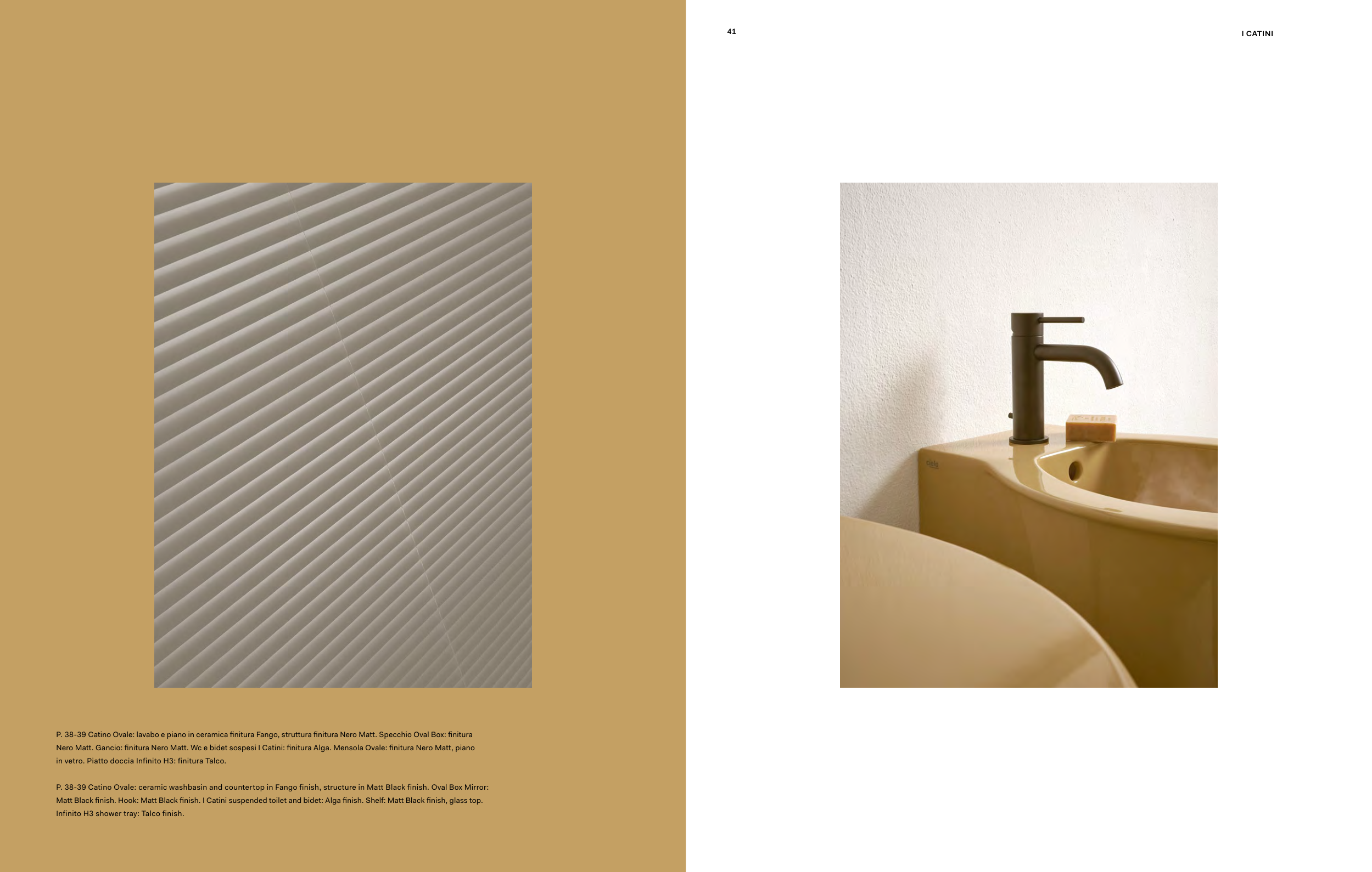 P. 38-39 Catino Ovale: ceramic washbasin and countertop in Fango finish, structure in Matt Black finish. Oval Box Mirror: