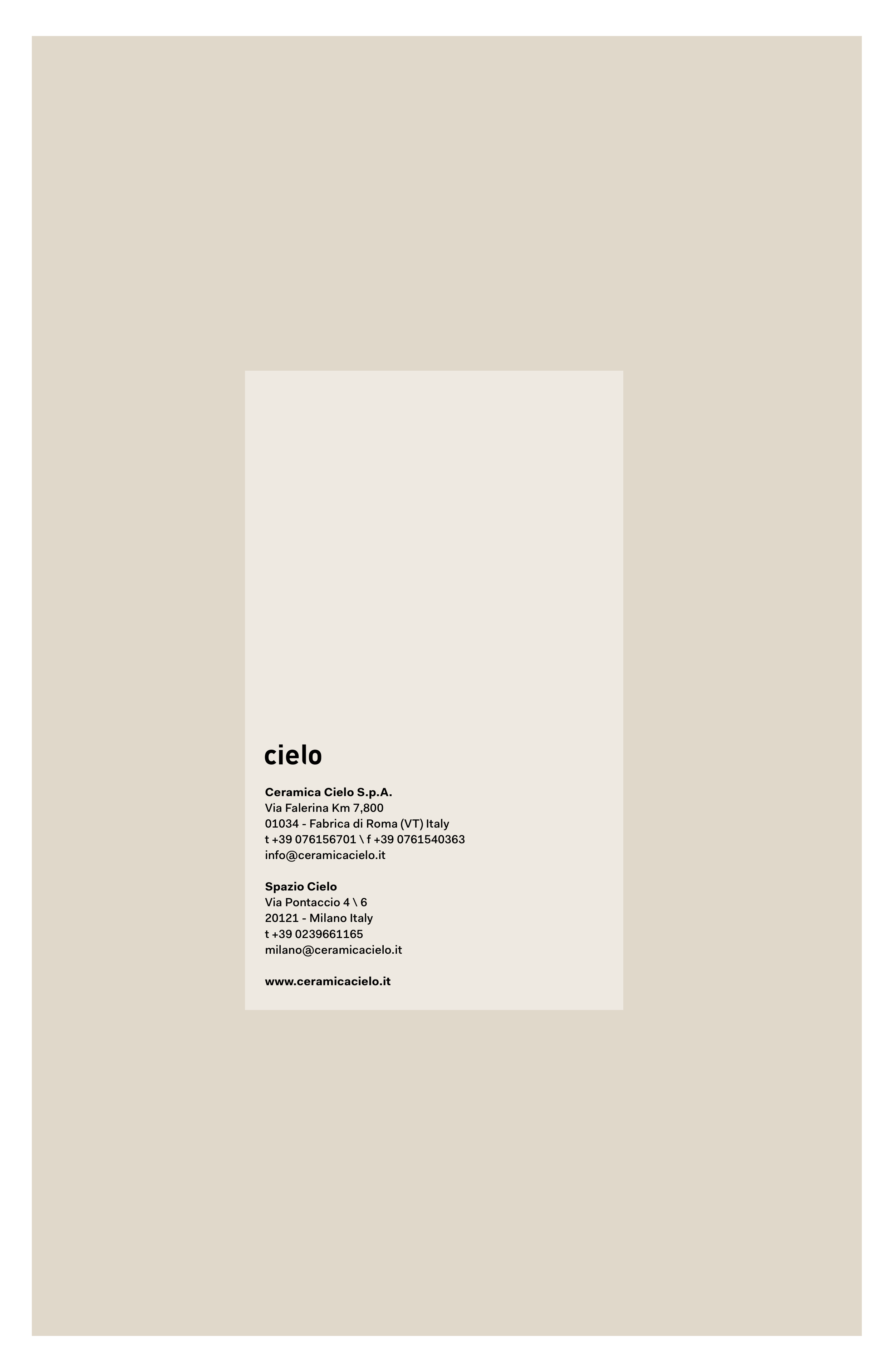 Ceramica Cielo S.p.A. Via Falerina Km 7,800 01034 - Fabrica di Roma (VT) Italy t +39 076156701 \ f +39 0761540363 info@ceramicacielo.it Spazio Cielo Via Pontaccio 4 \ 6 20121 - Milano Italy t +39 0239661165 milano@ceramicacielo.it www.ceramicacielo.it