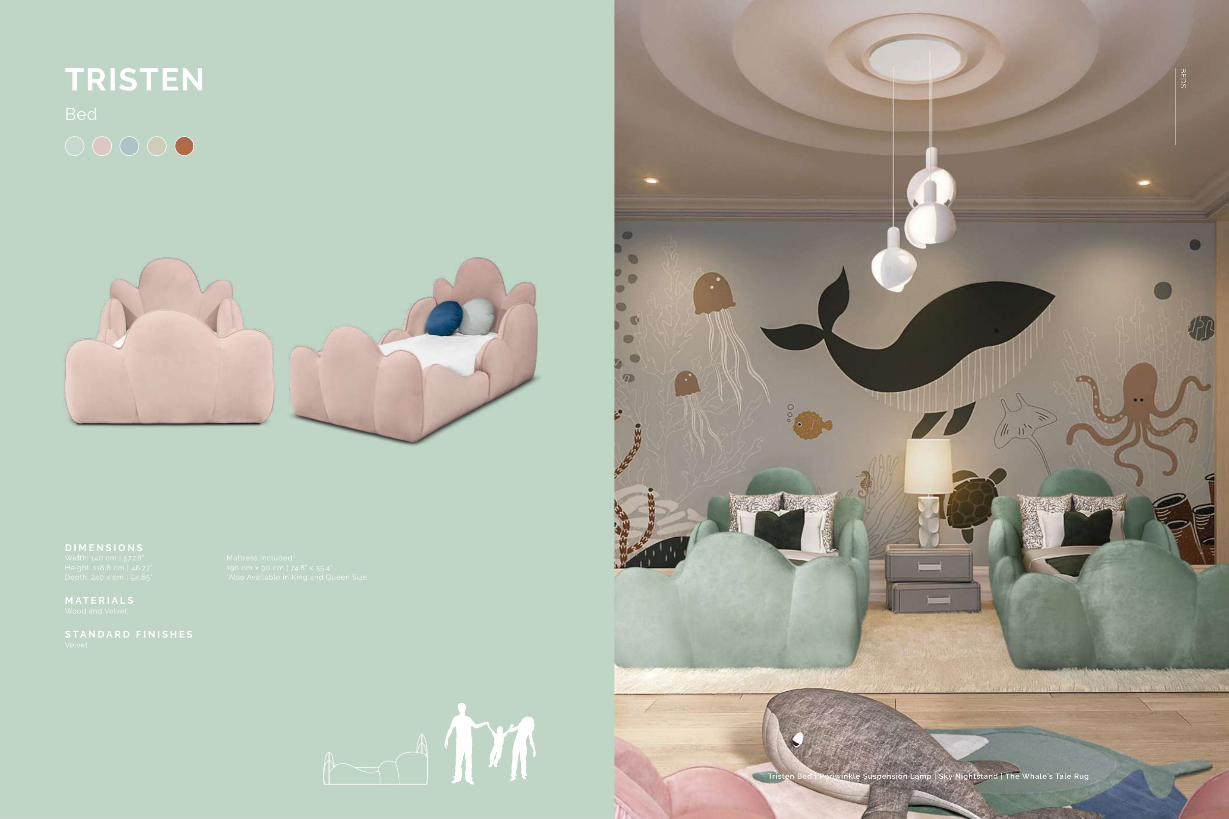 Tristen Bed | Periwinkle Suspension Lamp | Sky Nightstand | The Whale’s Tale Rug