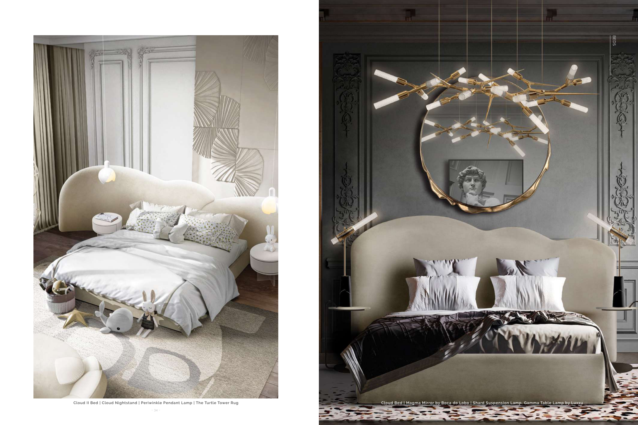 Cloud Bed | Magma Mirror by Boca do Lobo | Shard Suspension Lamp, Gamma Table Lamp by Luxxu