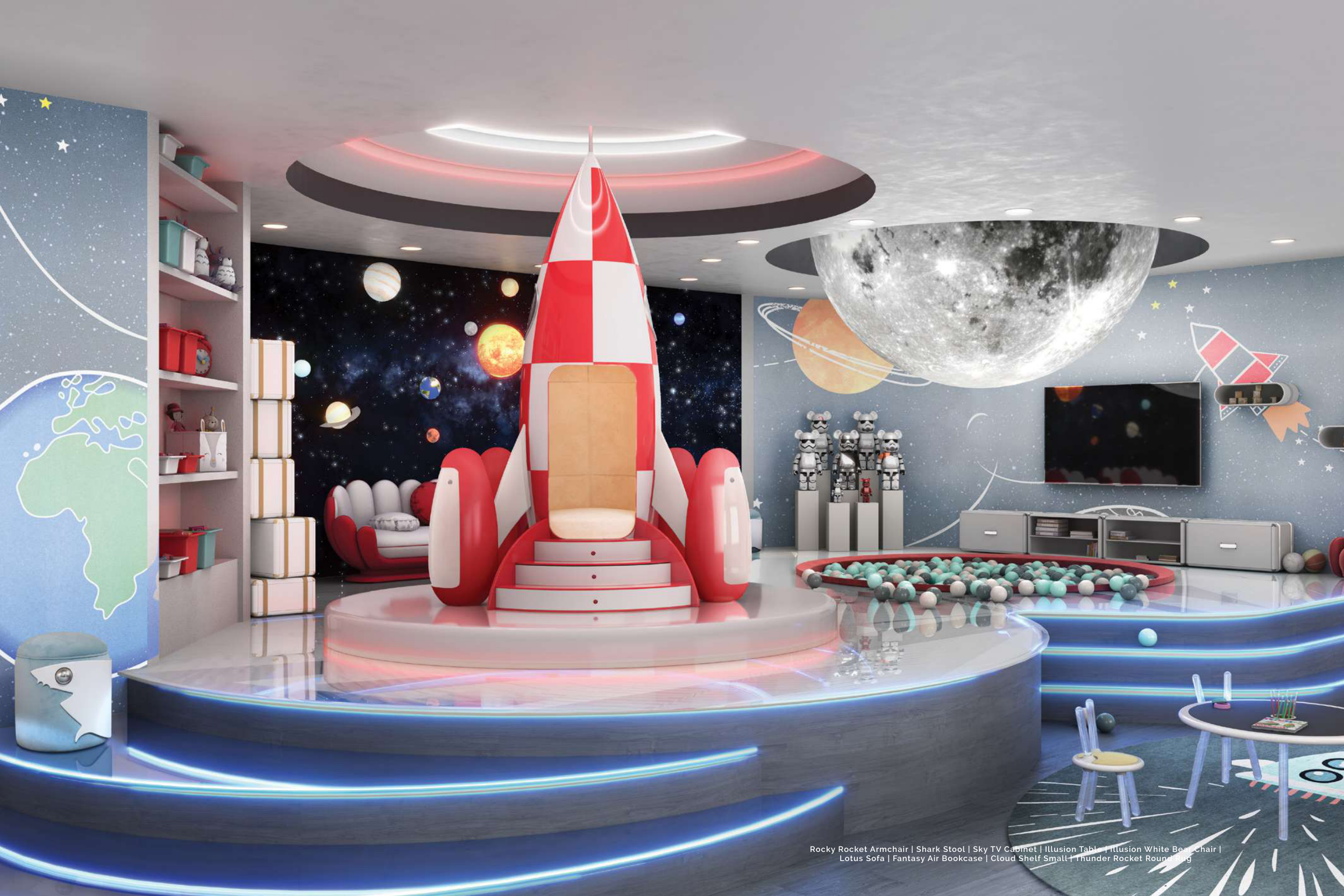 Rocky Rocket Armchair | Shark Stool | Sky TV Cabinet | Illusion Table | Illusion White Bear Chair |