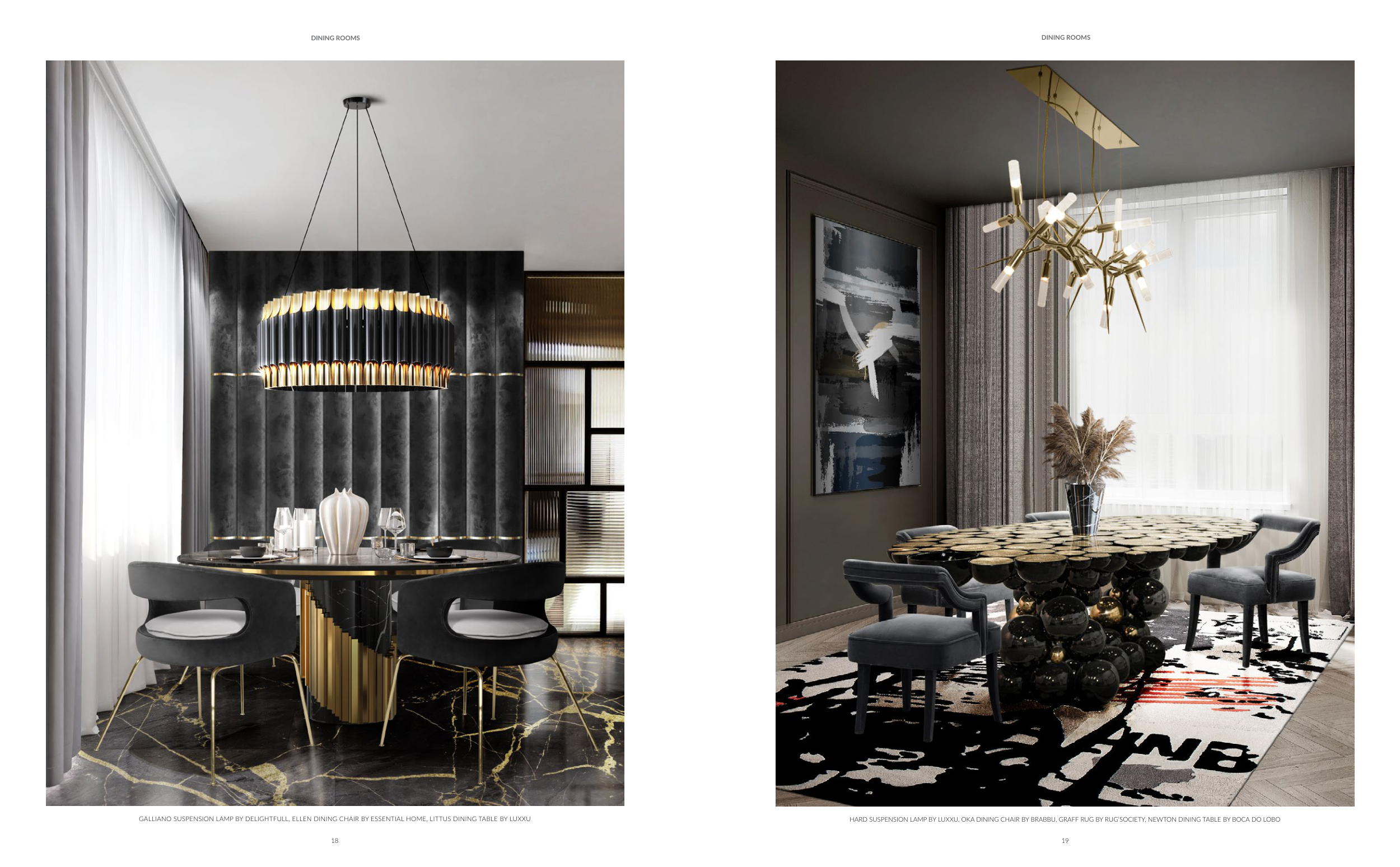 HARD SUSPENSION LAMP BY LUXXU, OKA DINING CHAIR BY BRABBU, GRAFF RUG BY RUG’SOCIETY, NEWTON DINING TABLE BY BOCA DO LOBO