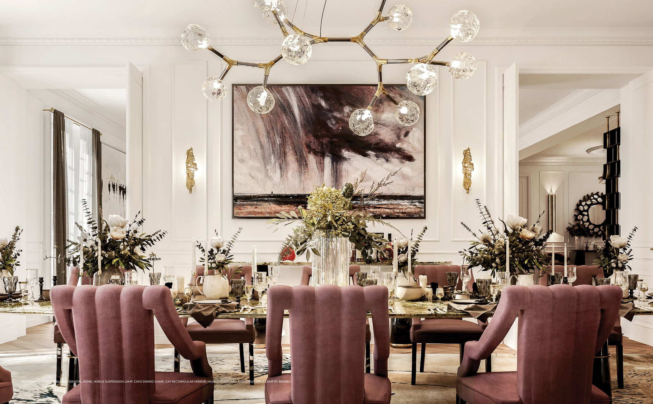 BERTOIA BIG DINING TABLE BY ESSENTIAL HOME, HORUS SUSPENSION LAMP, CAYO DINING CHAIR, CAY RECTANGULAR MIRROR, HUANG SIDEBOARD AND CYRUS TABLE LAMP BY BRABBU