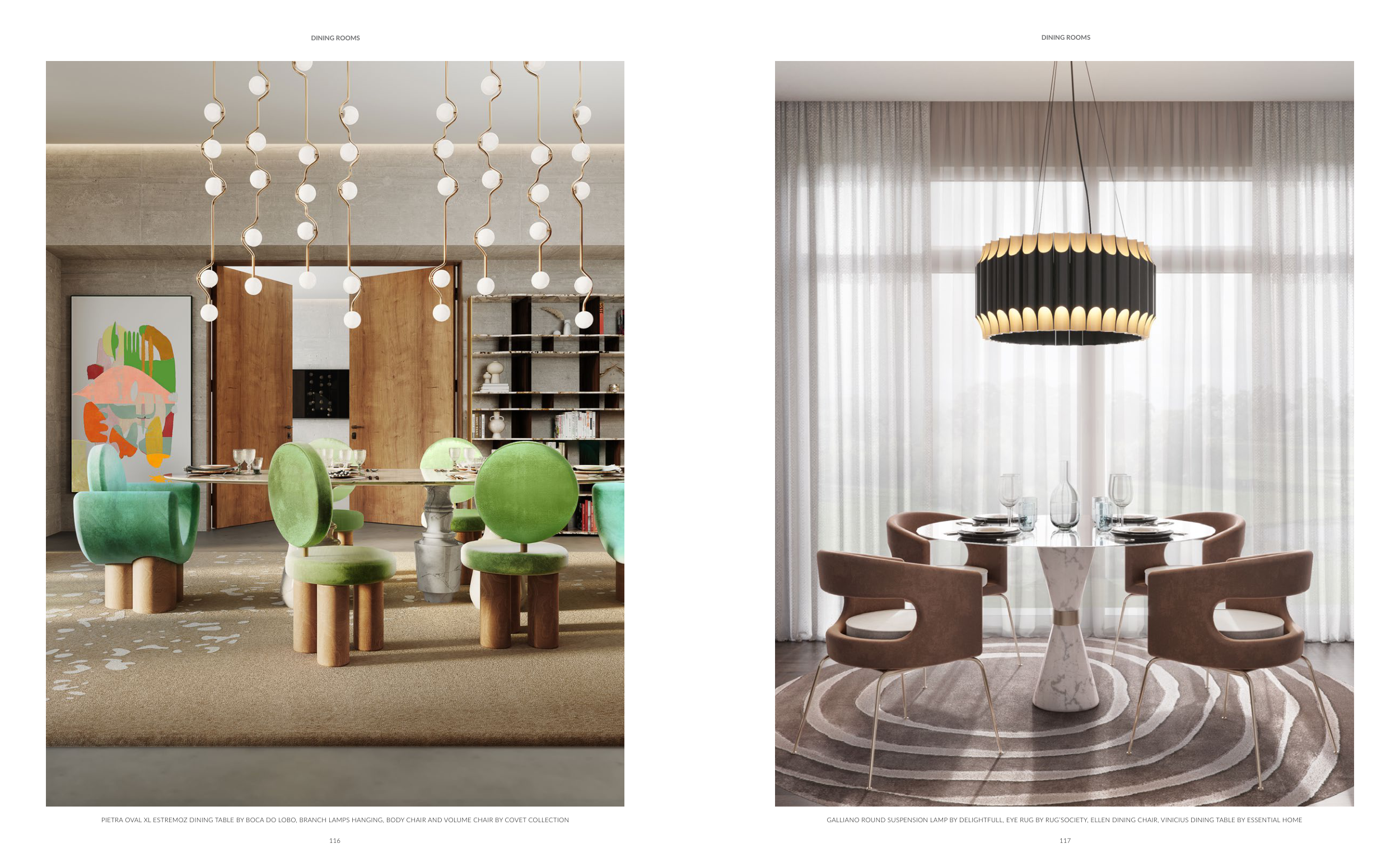 PIETRA OVAL XL ESTREMOZ DINING TABLE BY BOCA DO LOBO, BRANCH LAMPS HANGING, BODY CHAIR AND VOLUME CHAIR BY COVET COLLECTION