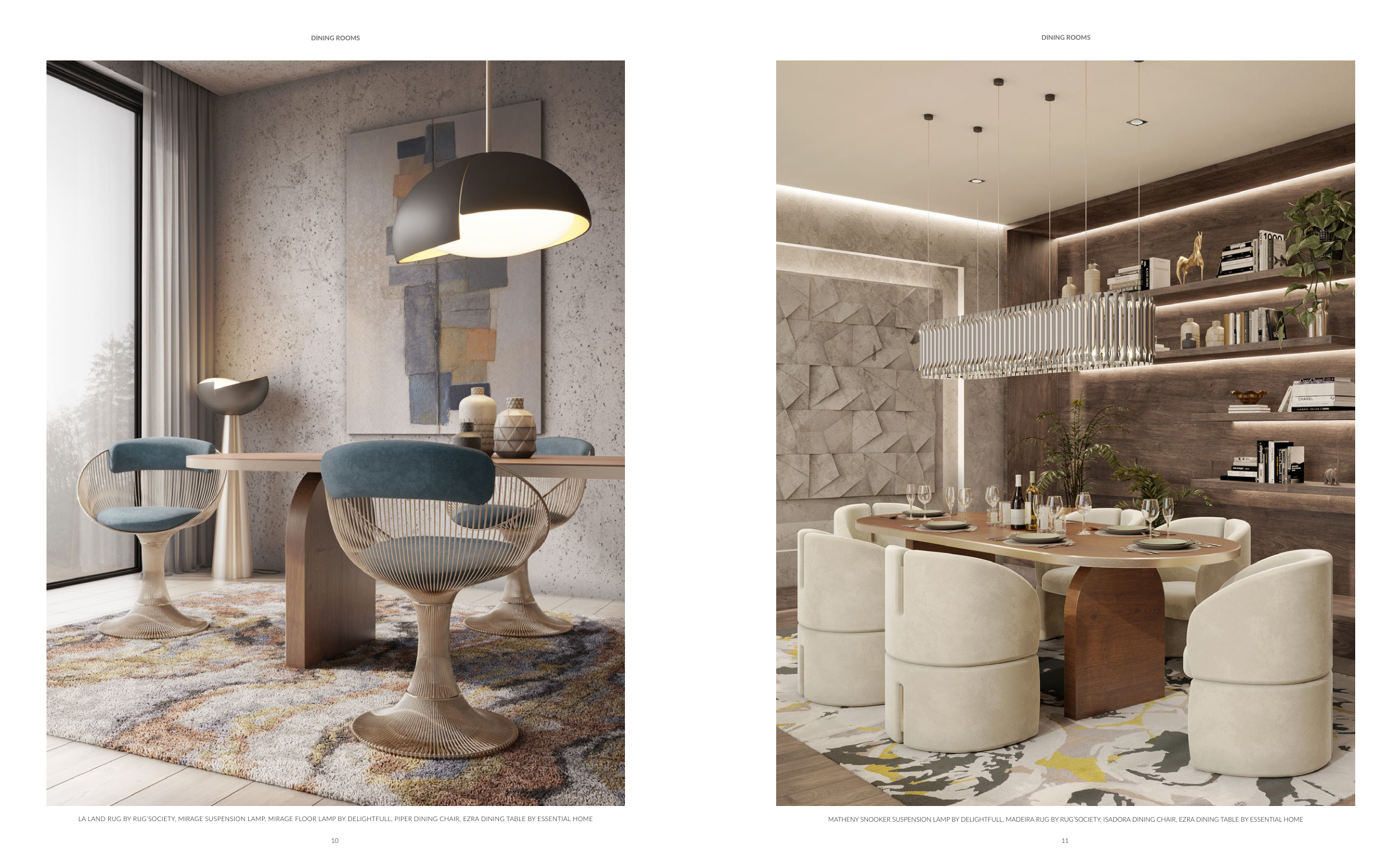 LA LAND RUG BY RUG’SOCIETY, MIRAGE SUSPENSION LAMP, MIRAGE FLOOR LAMP BY DELIGHTFULL, PIPER DINING CHAIR, EZRA DINING TABLE BY ESSENTIAL HOME