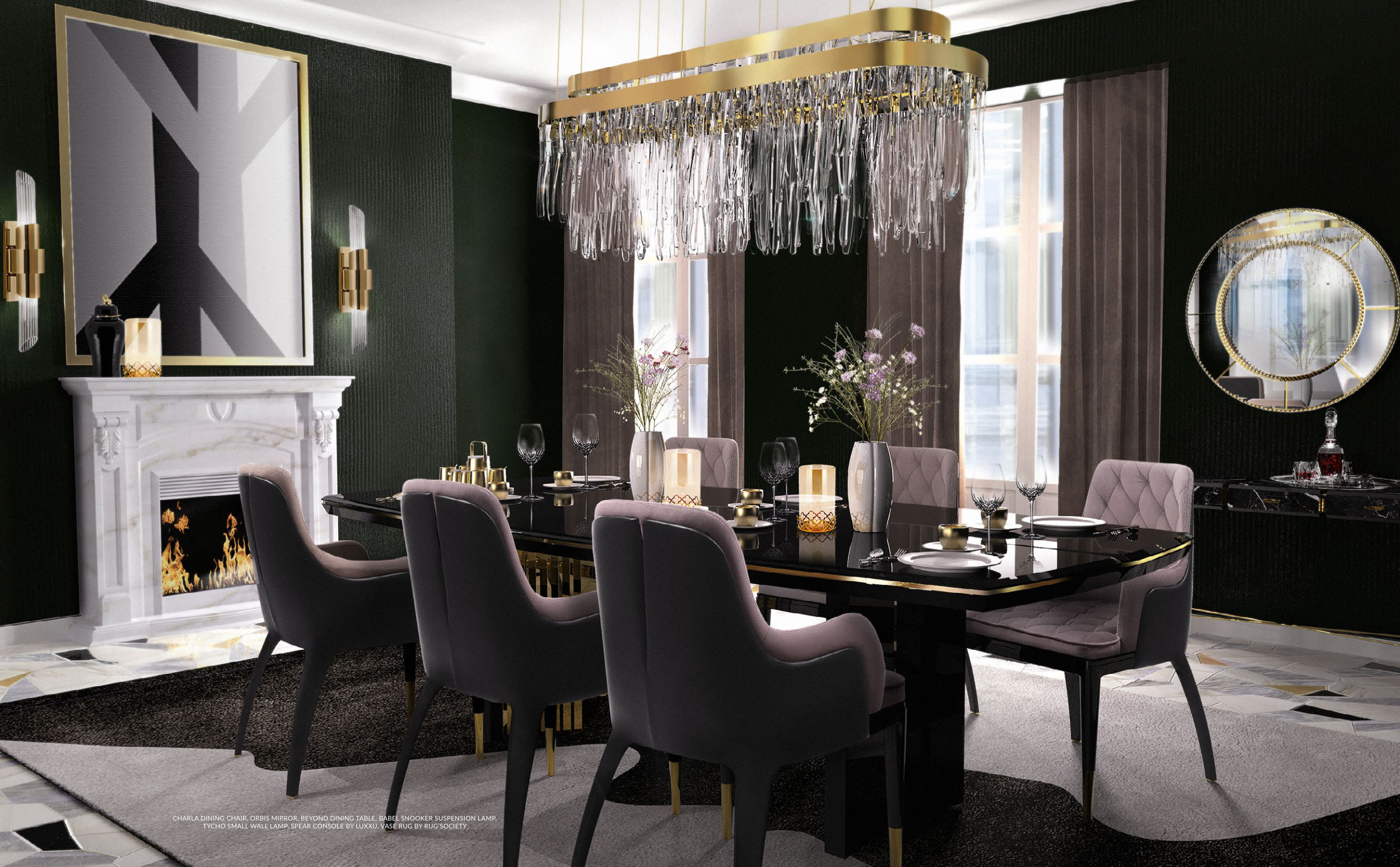 CHARLA DINING CHAIR, ORBIS MIRROR, BEYOND DINING TABLE, BABEL SNOOKER SUSPENSION LAMP,