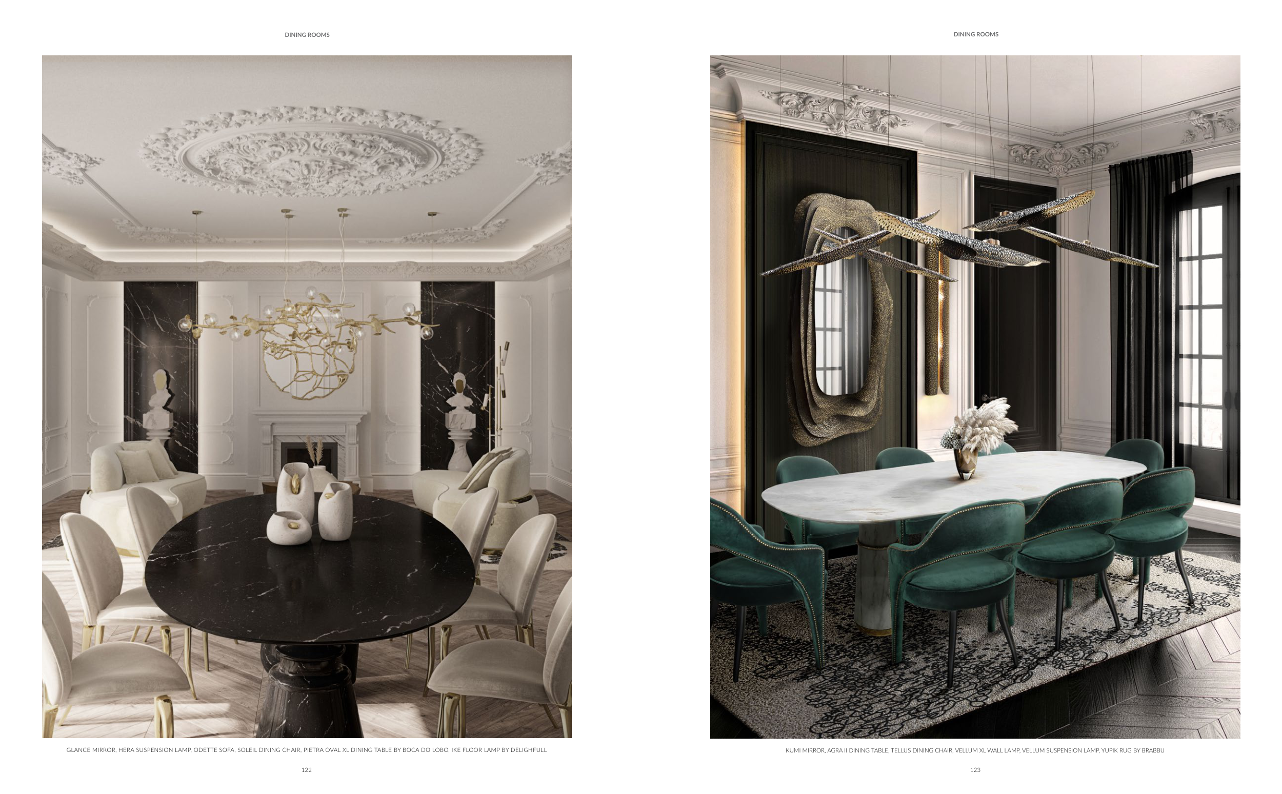 GLANCE MIRROR, HERA SUSPENSION LAMP, ODETTE SOFA, SOLEIL DINING CHAIR, PIETRA OVAL XL DINING TABLE BY BOCA DO LOBO, IKE FLOOR LAMP BY DELIGHFULL