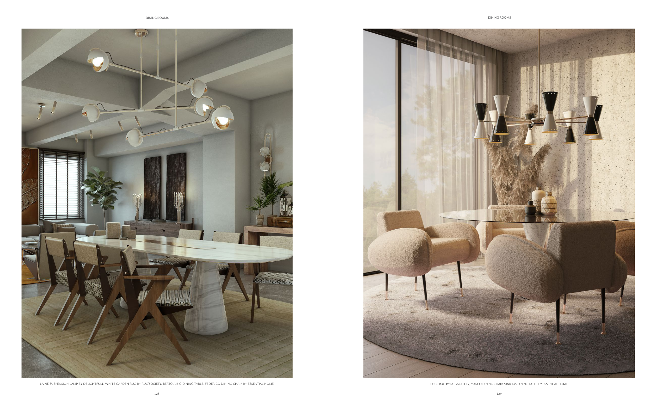 LAINE SUSPENSION LAMP BY DELIGHTFULL, WHITE GARDEN RUG BY RUG’SOCIETY, BERTOIA BIG DINING TABLE, FEDERICO DINING CHAIR BY ESSENTIAL HOME