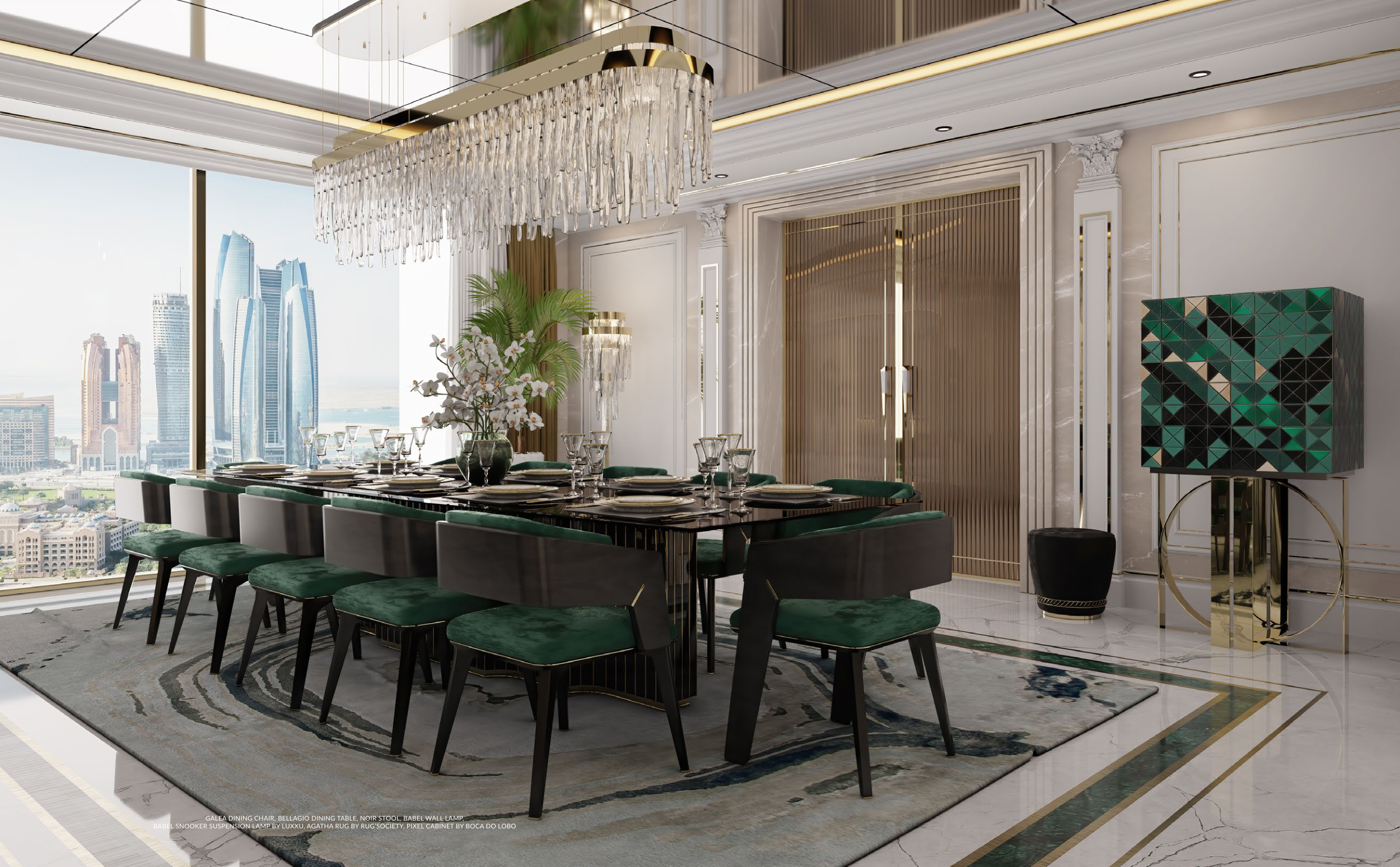 BABEL SNOOKER SUSPENSION LAMP BY LUXXU, AGATHA RUG BY RUG’SOCIETY, PIXEL CABINET BY BOCA DO LOBO