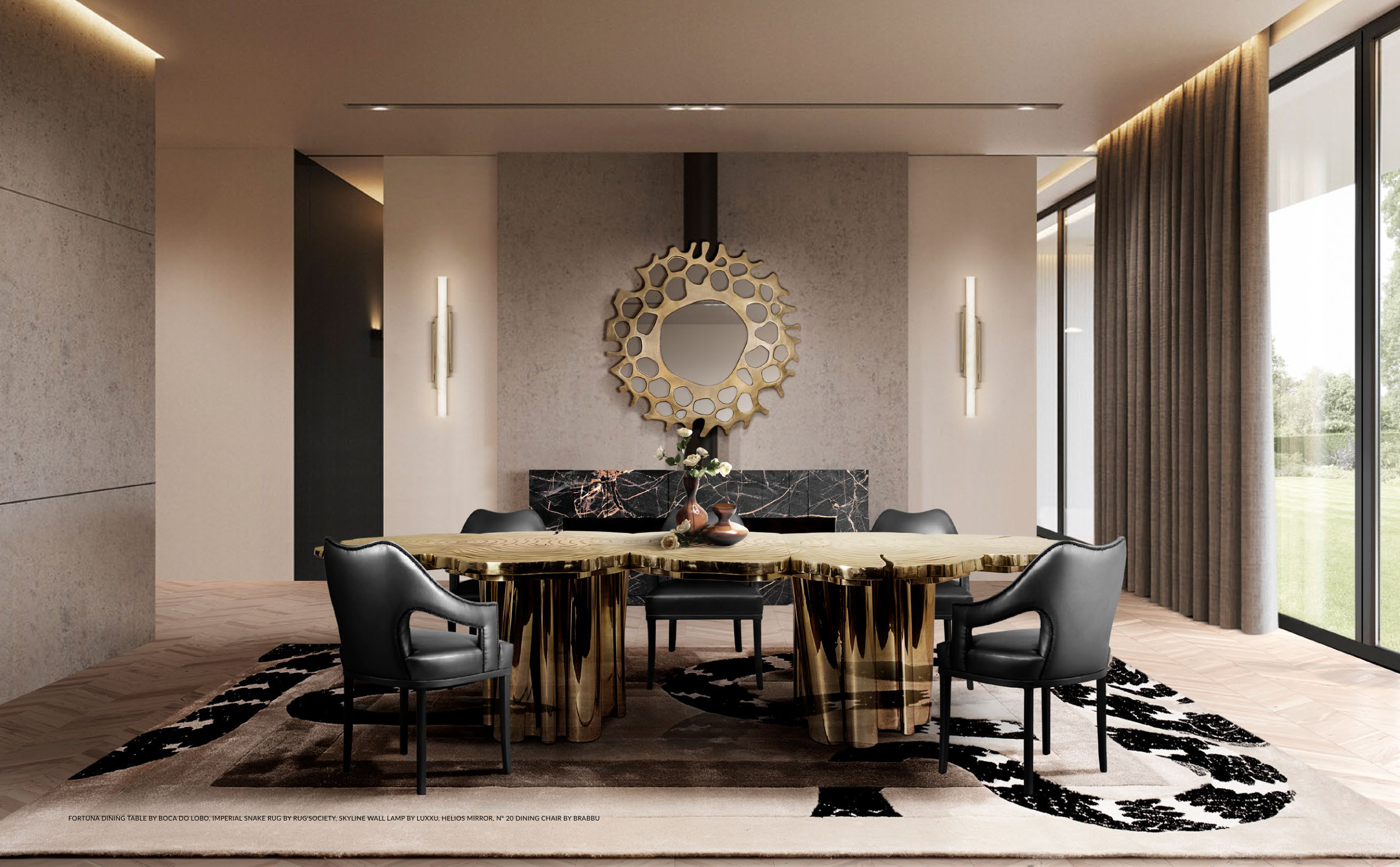 FORTUNA DINING TABLE BY BOCA DO LOBO, IMPERIAL SNAKE RUG BY RUG’SOCIETY, SKYLINE WALL LAMP BY LUXXU, HELIOS MIRROR, Nº 20 DINING CHAIR BY BRABBU