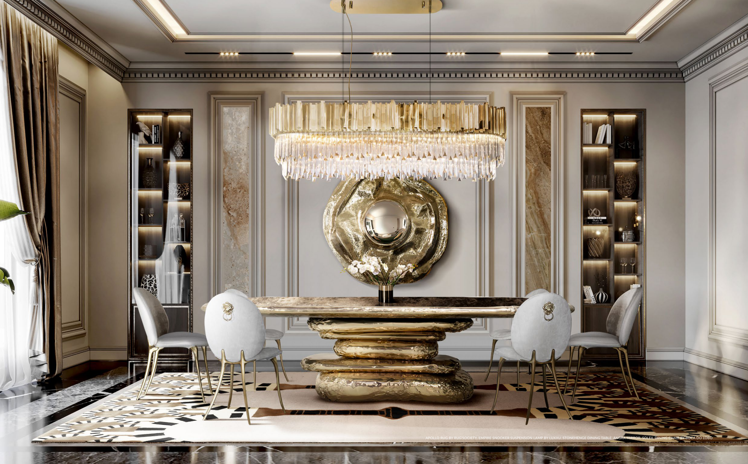 APOLLO RUG BY RUG’SOCIETY, EMPIRE SNOOKER SUSPENSION LAMP BY LUXXU, STONEHENGE DINING TABLE, ANGRA MIRROR, SOLEIL DINING CHAIR BY BOCA DO LOBO