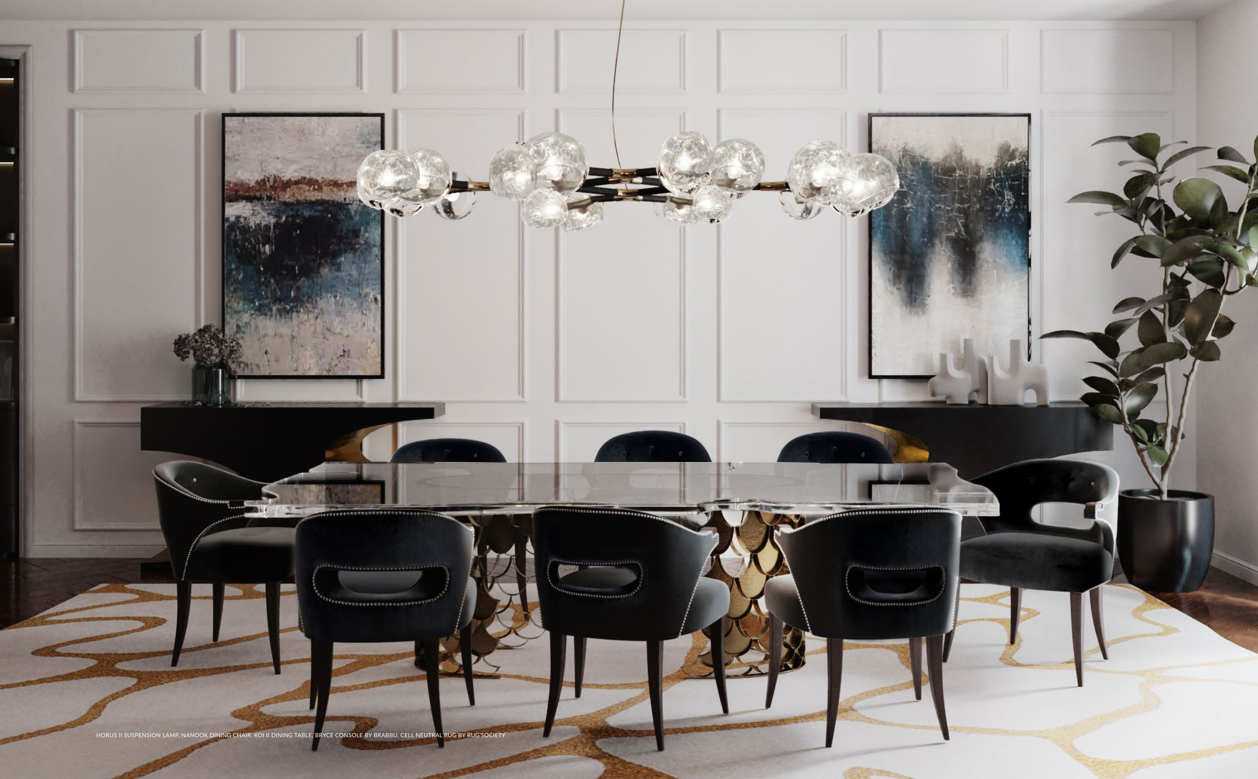 HORUS II SUSPENSION LAMP, NANOOK DINING CHAIR, KOI II DINING TABLE, BRYCE CONSOLE BY BRABBU, CELL NEUTRAL RUG BY RUG’SOCIETY