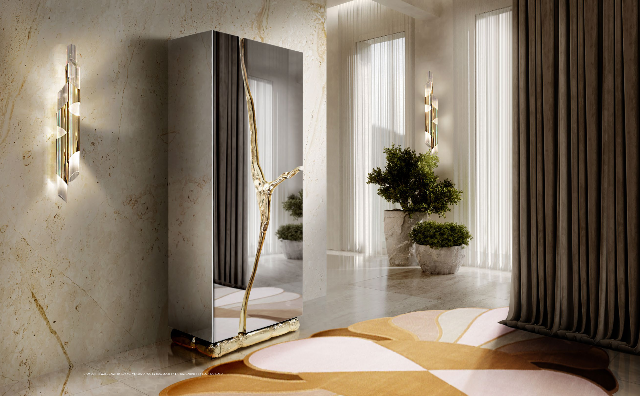 DRAYCOTT II WALL LAMP BY LUXXU, MERMAID RUG BY RUG’SOCIETY, LAPIAZ CABINET BY BOCA DO LOBO