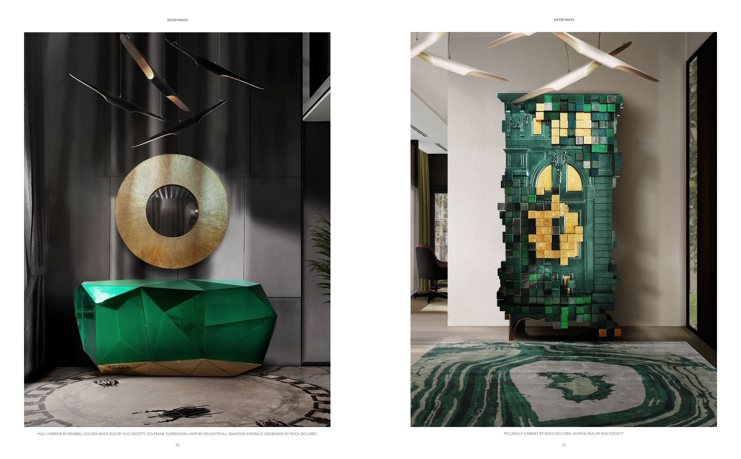 HULI I MIRROR BY BRABBU, GOLDEN BUGS RUG BY RUG’SOCIETY, COLTRANE SUSPENSION LAMP BY DELIGHTFULL, DIAMOND EMERALD SIDEBOARD BY BOCA DO LOBO