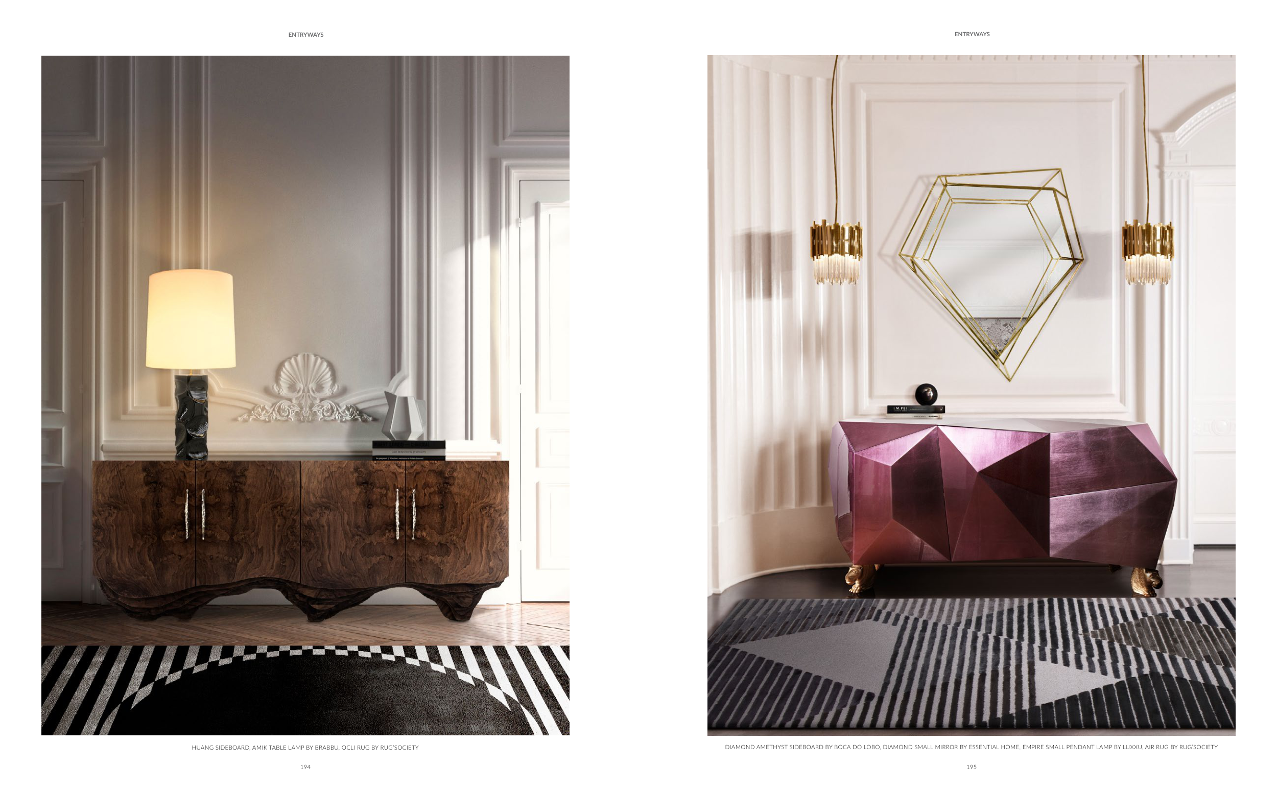 DIAMOND AMETHYST SIDEBOARD BY BOCA DO LOBO, DIAMOND SMALL MIRROR BY ESSENTIAL HOME, EMPIRE SMALL PENDANT LAMP BY LUXXU, AIR RUG BY RUG’SOCIETY
