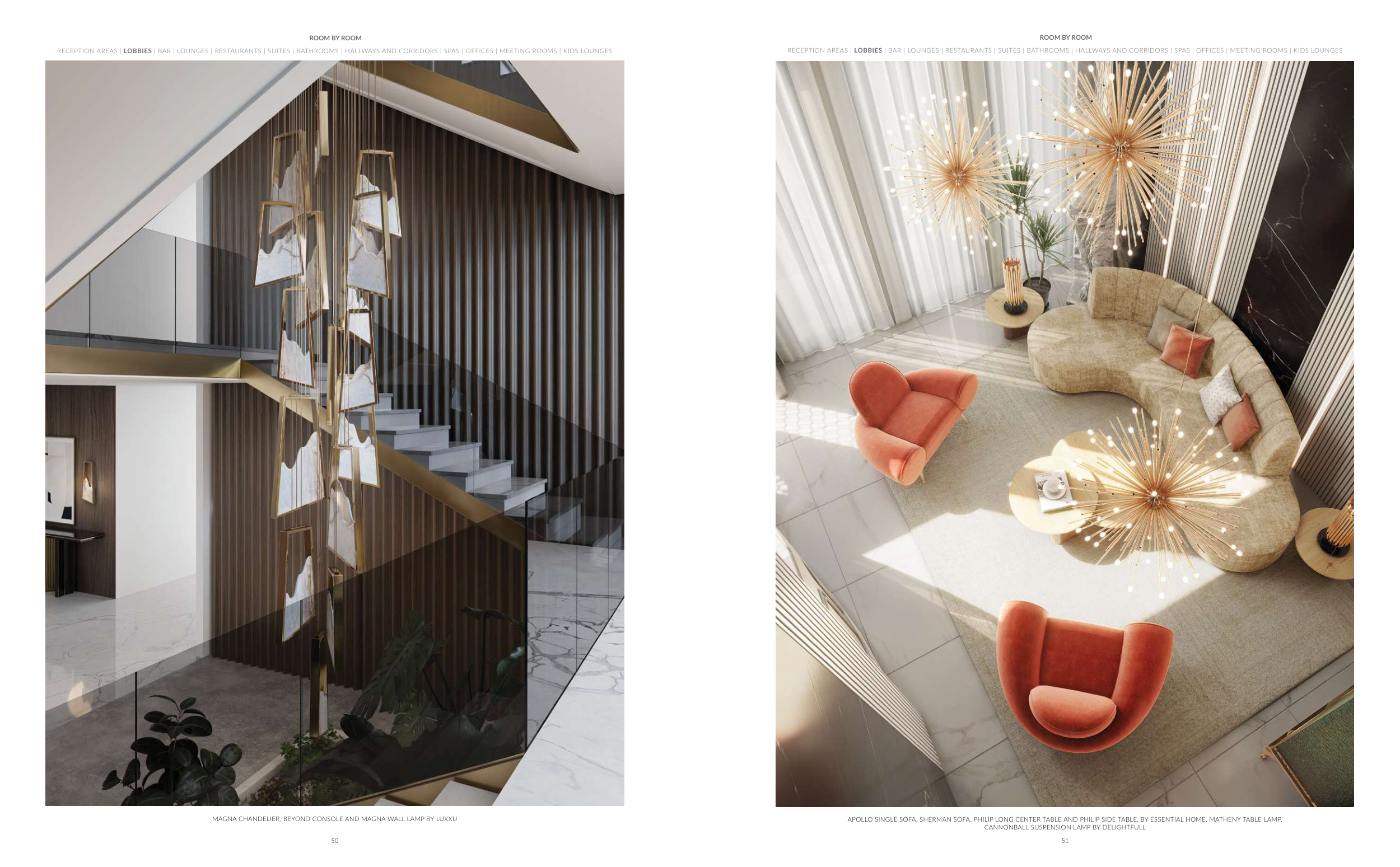 RECEPTION AREAS | LOBBIES | BAR | LOUNGES | RESTAURANTS | SUITES | BATHROOMS | HALLWAYS AND CORRIDORS | SPAS | OFFICES | MEETING ROOMS | KIDS LOUNGES