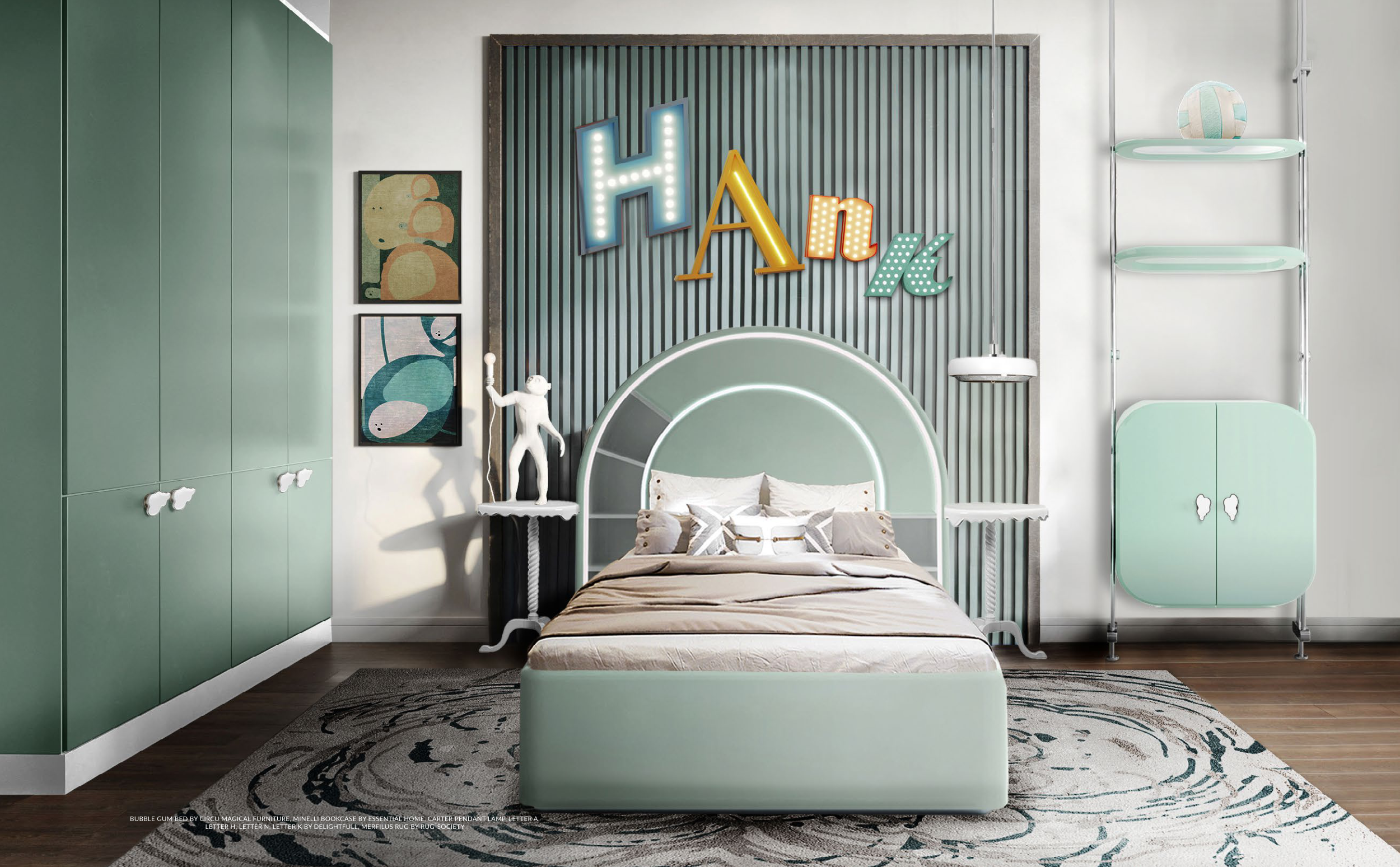 BUBBLE GUM BED BY CIRCU MAGICAL FURNITURE, MINELLI BOOKCASE BY ESSENTIAL HOME, CARTER PENDANT LAMP, LETTER A,