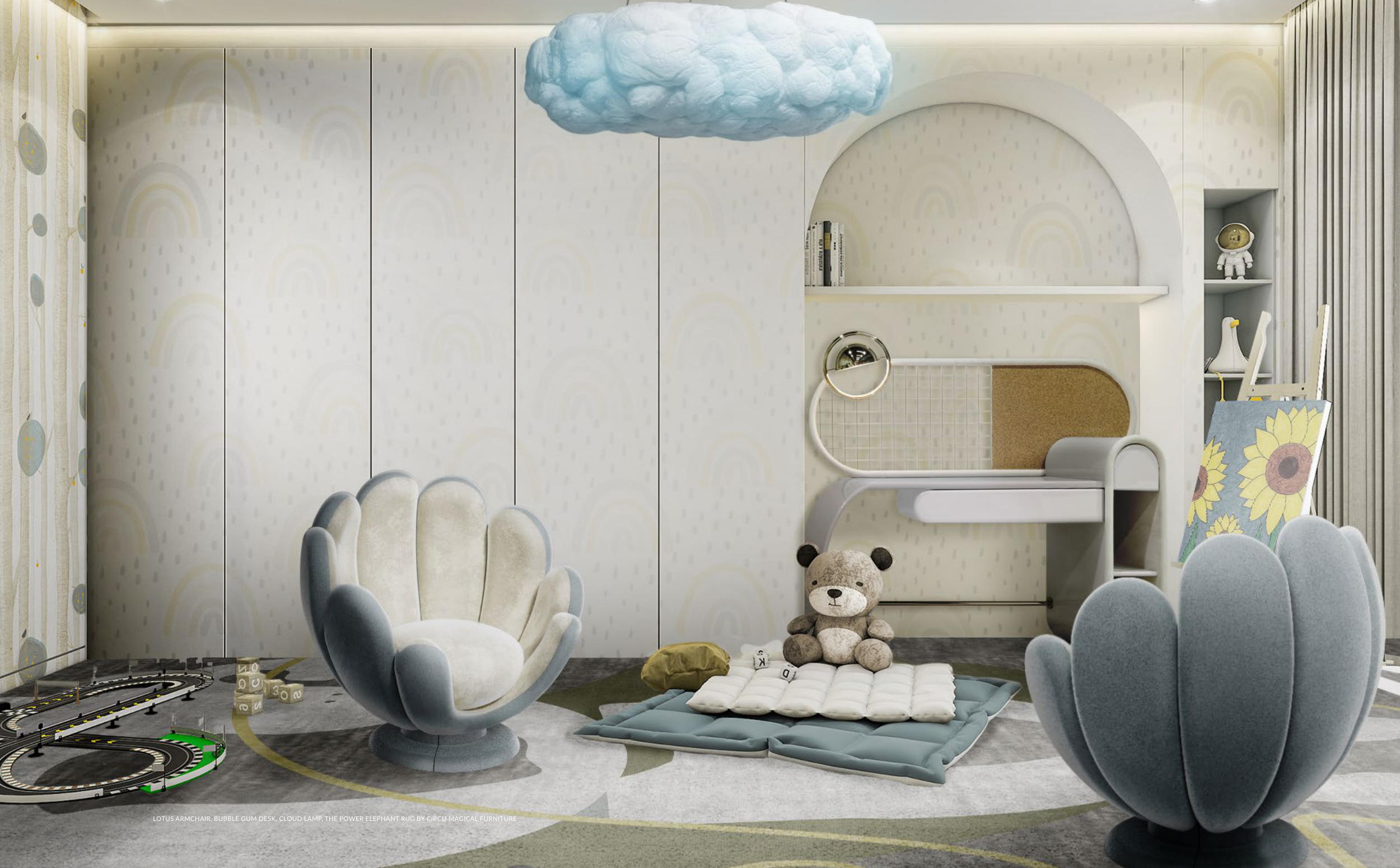 LOTUS ARMCHAIR, BUBBLE GUM DESK, CLOUD LAMP, THE POWER ELEPHANT RUG BY CIRCU MAGICAL FURNITURE
