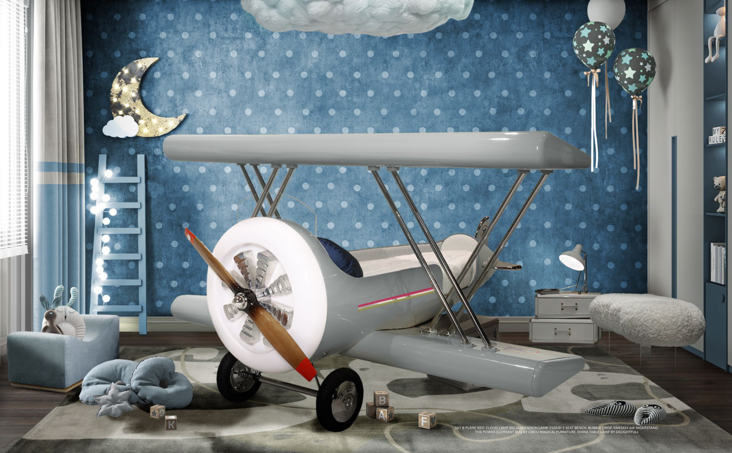 SKY B PLANE BED, CLOUD LAMP BIG SUSPENSION LAMP, CLOUD 2 SEAT BENCH, BUBBLE DROP, FANTASY AIR NIGHTSTAND,