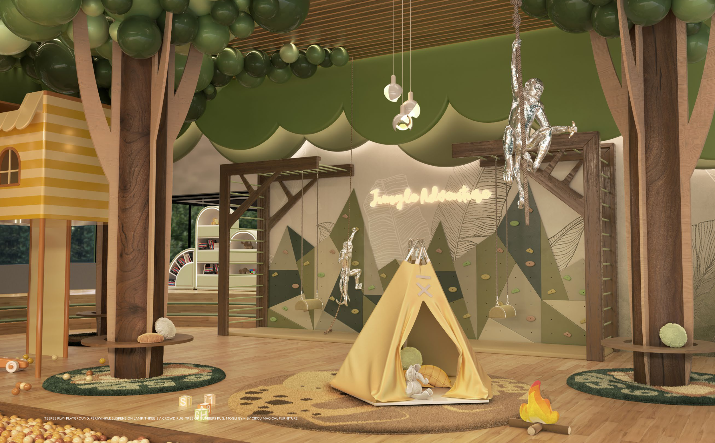 TEEPEE PLAY PLAYGROUND, PERIWINKLE SUSPENSION LAMP, THREE´S A CROWD RUG, TREE OF NUMBERS RUG, MOGLI GYM BY CIRCU MAGICAL FURNITURE