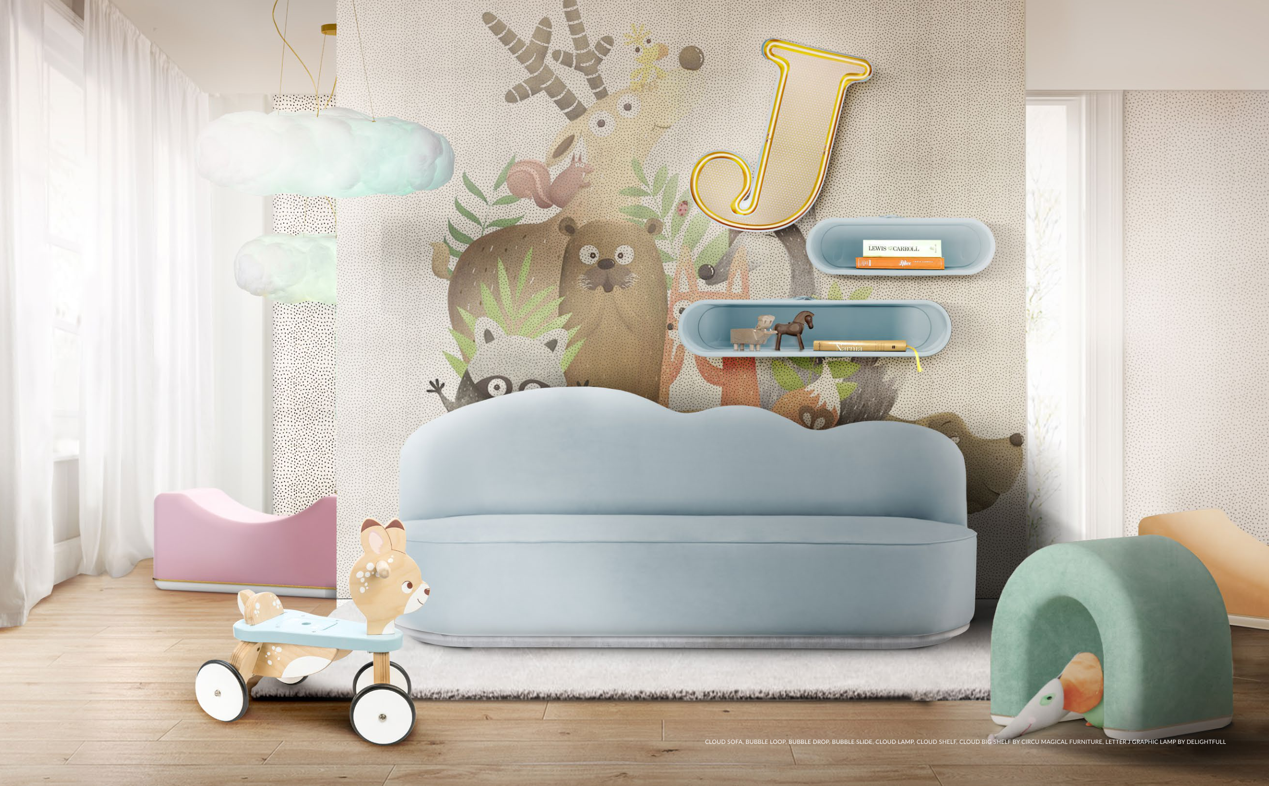 CLOUD SOFA, BUBBLE LOOP, BUBBLE DROP, BUBBLE SLIDE, CLOUD LAMP, CLOUD SHELF, CLOUD BIG SHELF BY CIRCU MAGICAL FURNITURE, LETTER J GRAPHIC LAMP BY DELIGHTFULL