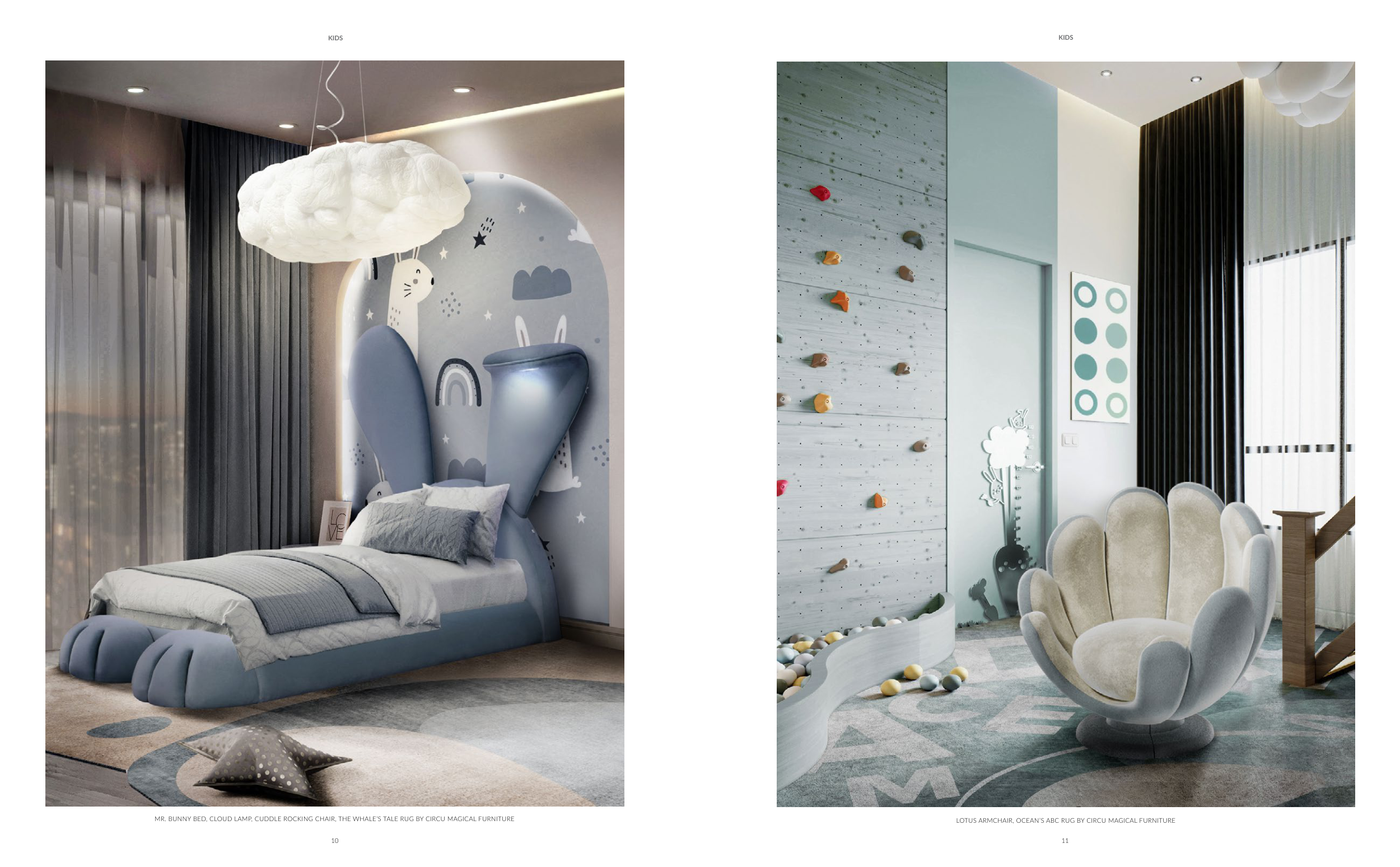MR. BUNNY BED, CLOUD LAMP, CUDDLE ROCKING CHAIR, THE WHALE’S TALE RUG BY CIRCU MAGICAL FURNITURE