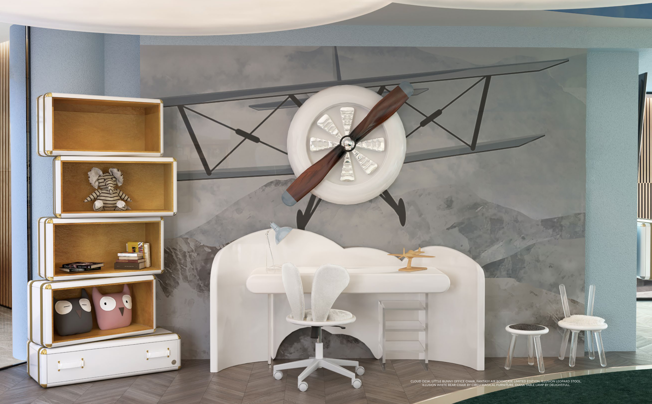 CLOUD DESK, LITTLE BUNNY OFFICE CHAIR, FANTASY AIR BOOKCASE LIMITED EDITION, ILLUSION LEOPARD STOOL,