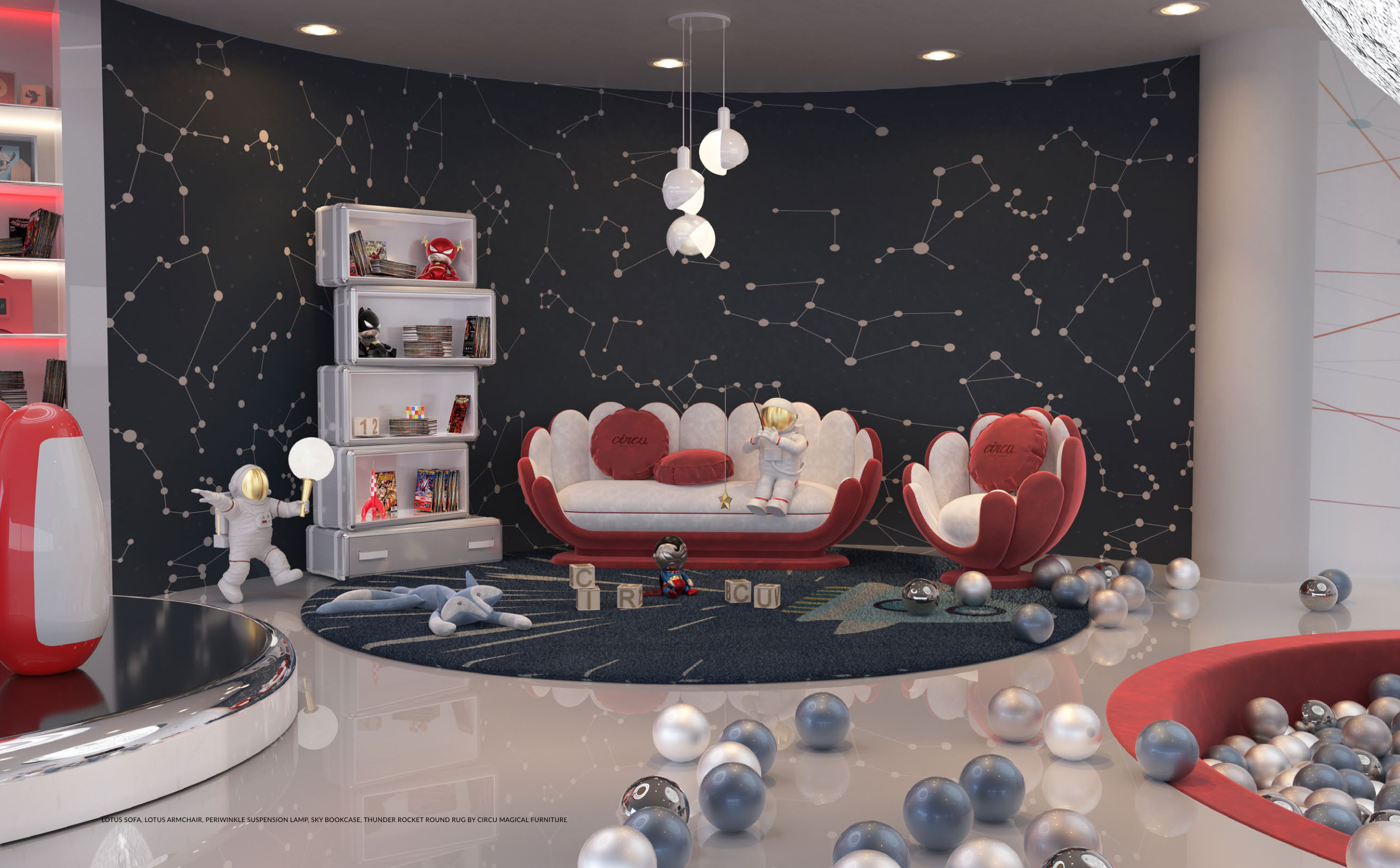LOTUS SOFA, LOTUS ARMCHAIR, PERIWINKLE SUSPENSION LAMP, SKY BOOKCASE, THUNDER ROCKET ROUND RUG BY CIRCU MAGICAL FURNITURE