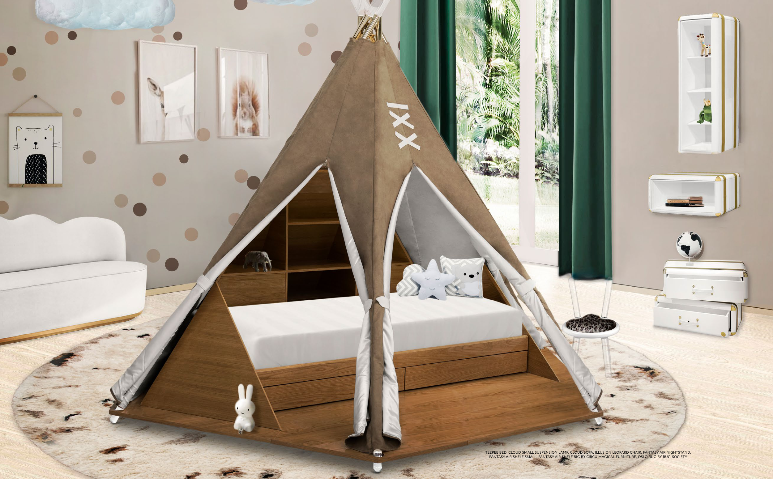 TEEPEE BED, CLOUD SMALL SUSPENSION LAMP, CLOUD SOFA, ILLUSION LEOPARD CHAIR, FANTASY AIR NIGHTSTAND,