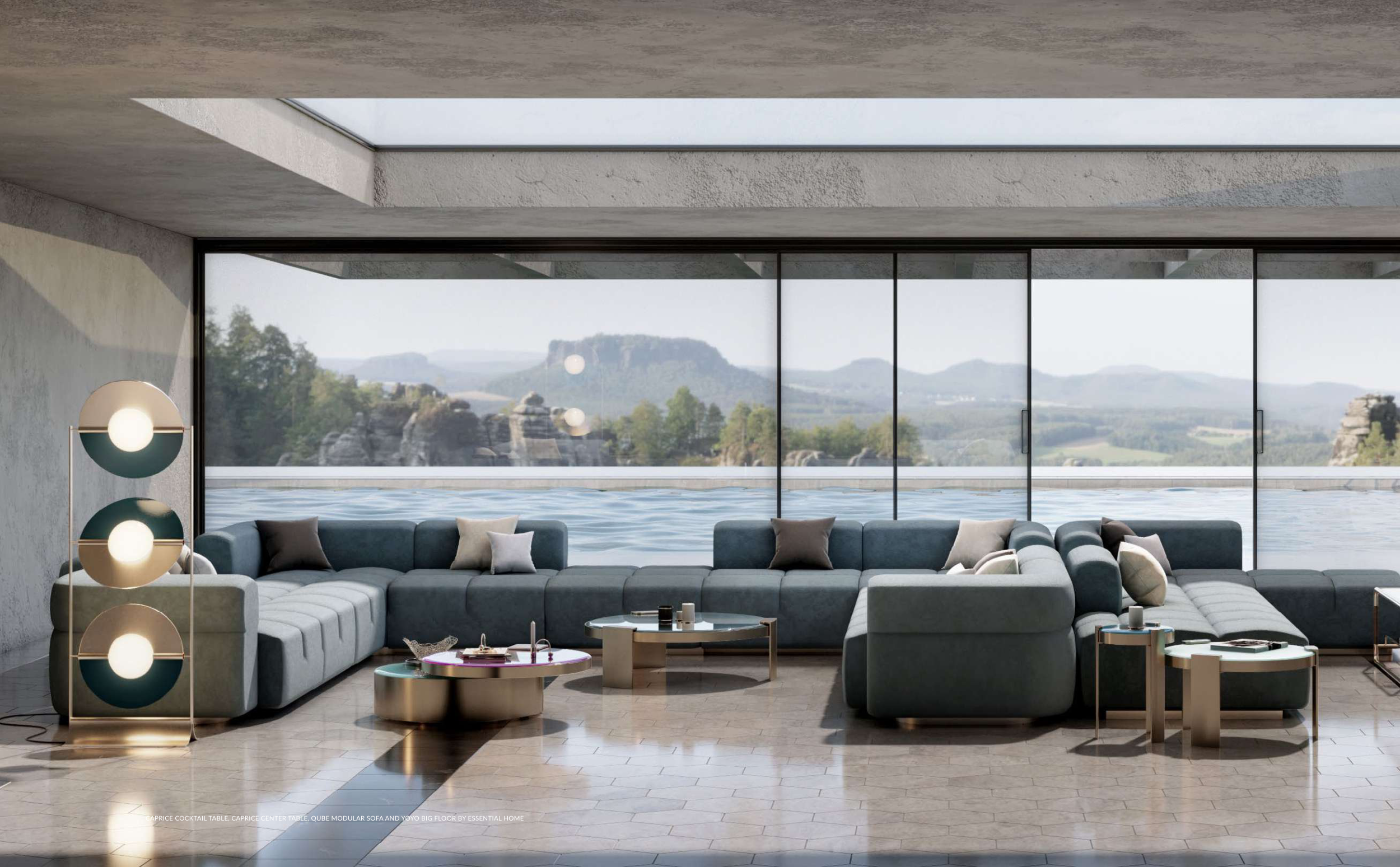CAPRICE COCKTAIL TABLE, CAPRICE CENTER TABLE, QUBE MODULAR SOFA AND YOYO BIG FLOOR BY ESSENTIAL HOME