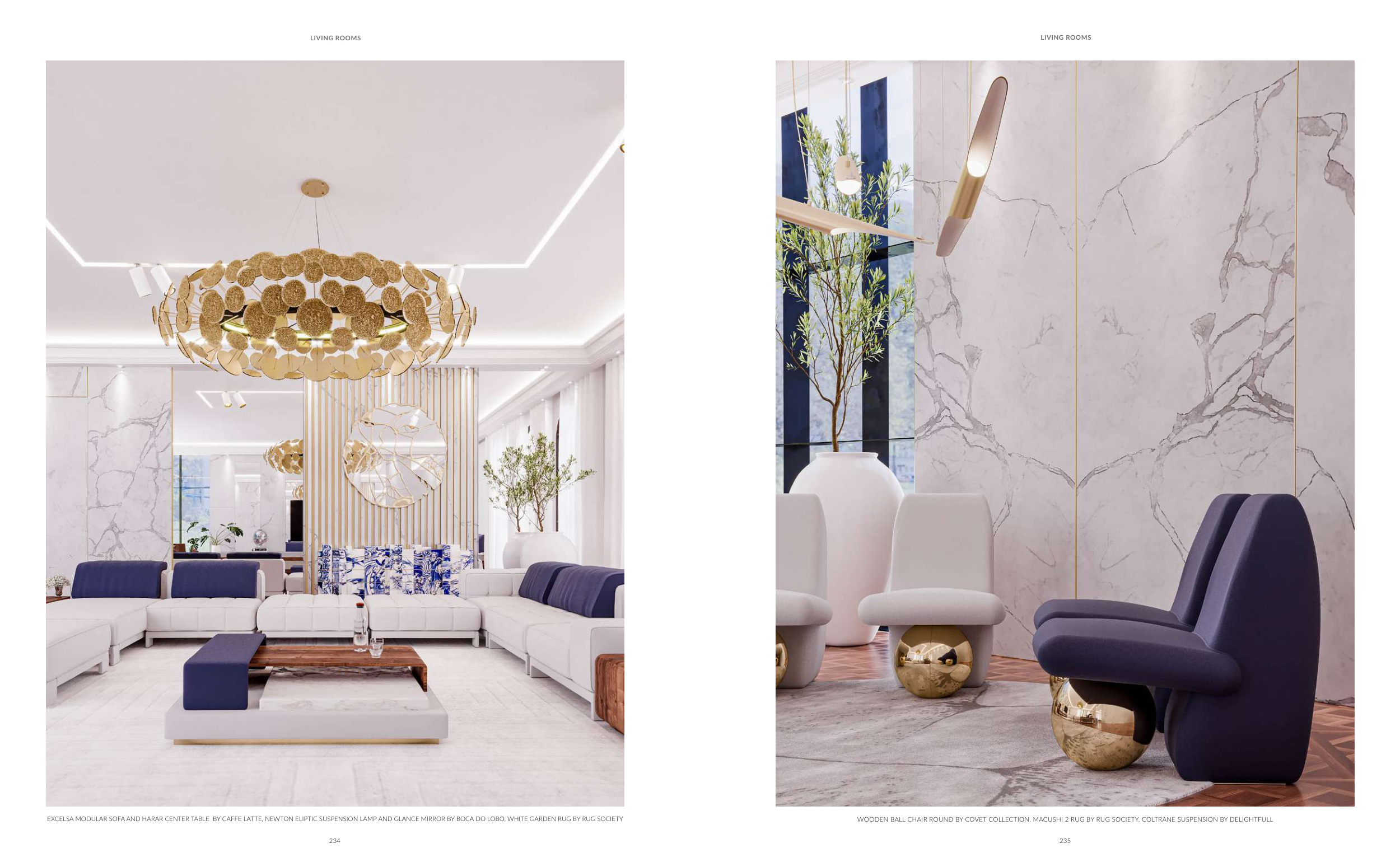 EXCELSA MODULAR SOFA AND HARAR CENTER TABLE BY CAFFE LATTE, NEWTON ELIPTIC SUSPENSION LAMP AND GLANCE MIRROR BY BOCA DO LOBO, WHITE GARDEN RUG BY RUG SOCIETY