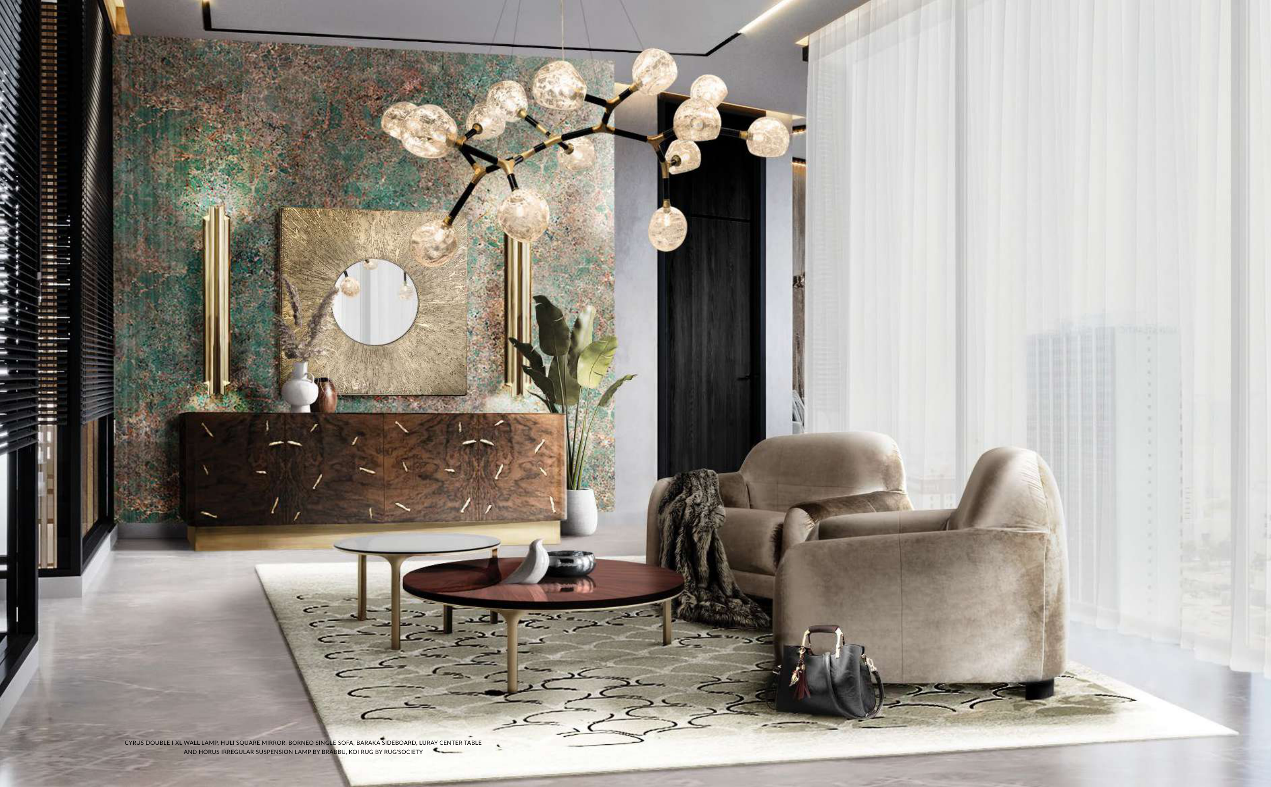 CYRUS DOUBLE I XL WALL LAMP, HULI SQUARE MIRROR, BORNEO SINGLE SOFA, BARAKA SIDEBOARD, LURAY CENTER TABLE