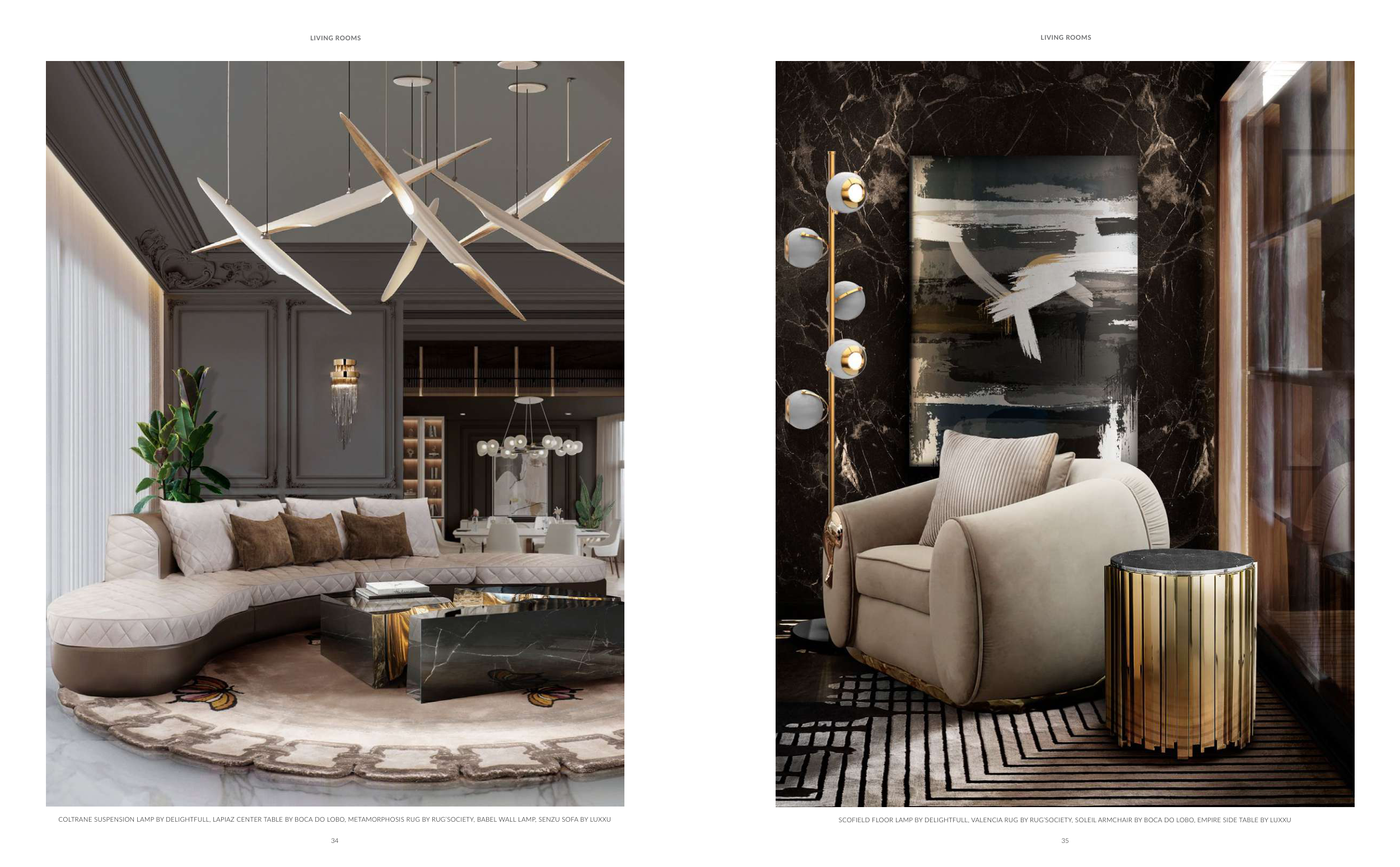 COLTRANE SUSPENSION LAMP BY DELIGHTFULL, LAPIAZ CENTER TABLE BY BOCA DO LOBO, METAMORPHOSIS RUG BY RUG’SOCIETY, BABEL WALL LAMP, SENZU SOFA BY LUXXU