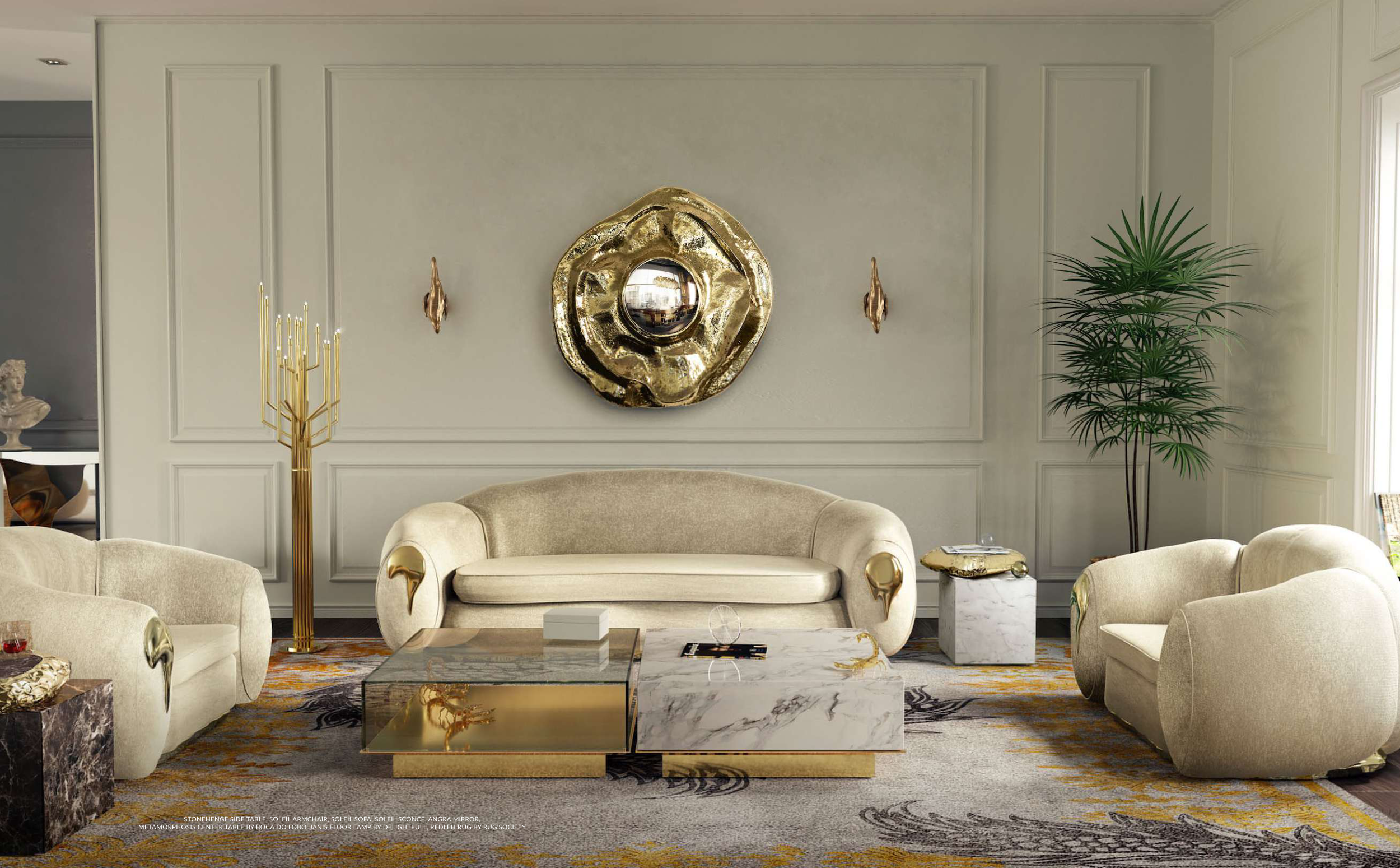 STONEHENGE SIDE TABLE, SOLEIL ARMCHAIR, SOLEIL SOFA, SOLEIL SCONCE, ANGRA MIRROR,