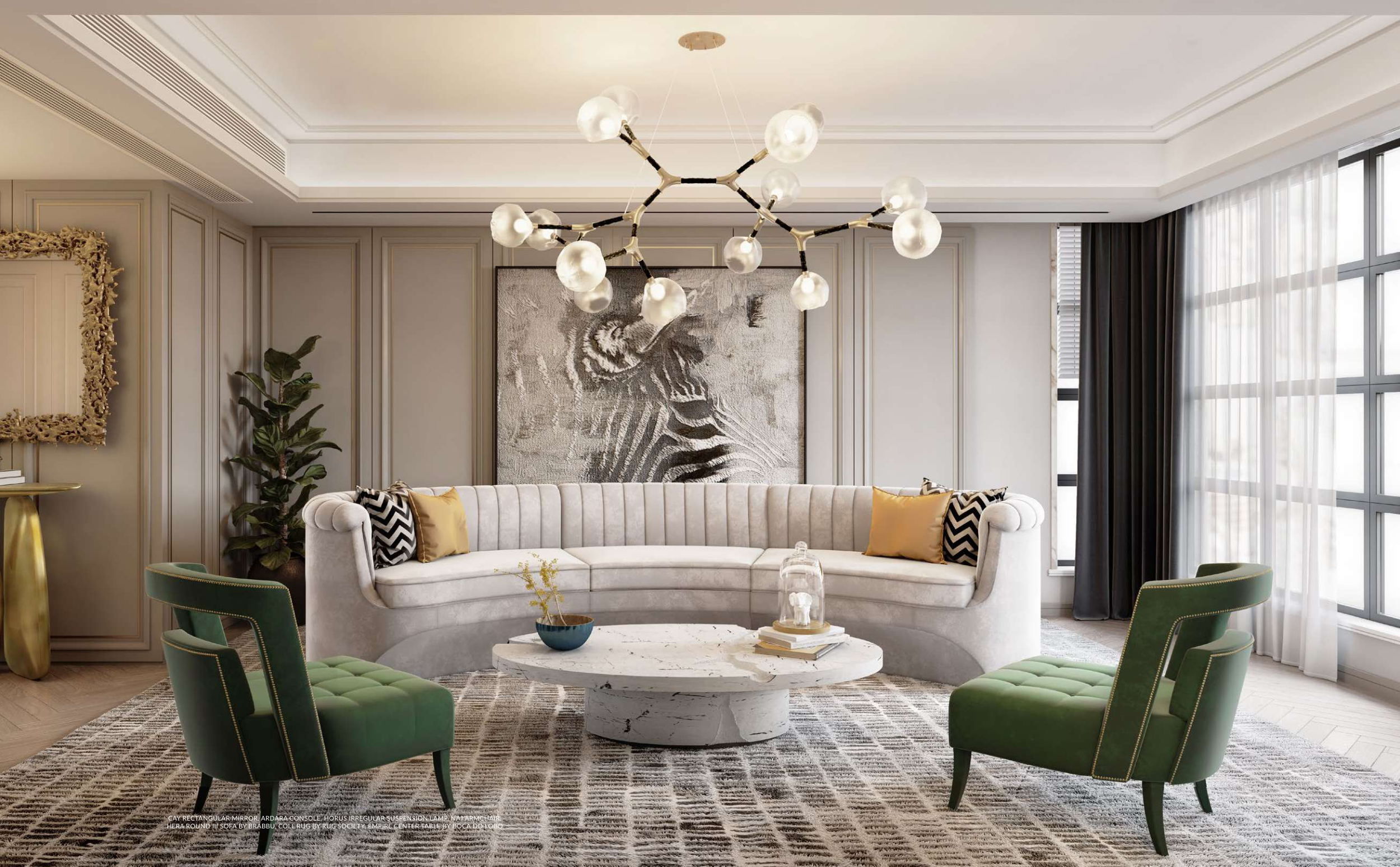 HERA ROUND III SOFA BY BRABBU, COLL RUG BY RUG’SOCIETY, EMPIRE CENTER TABLE BY BOCA DO LOBO