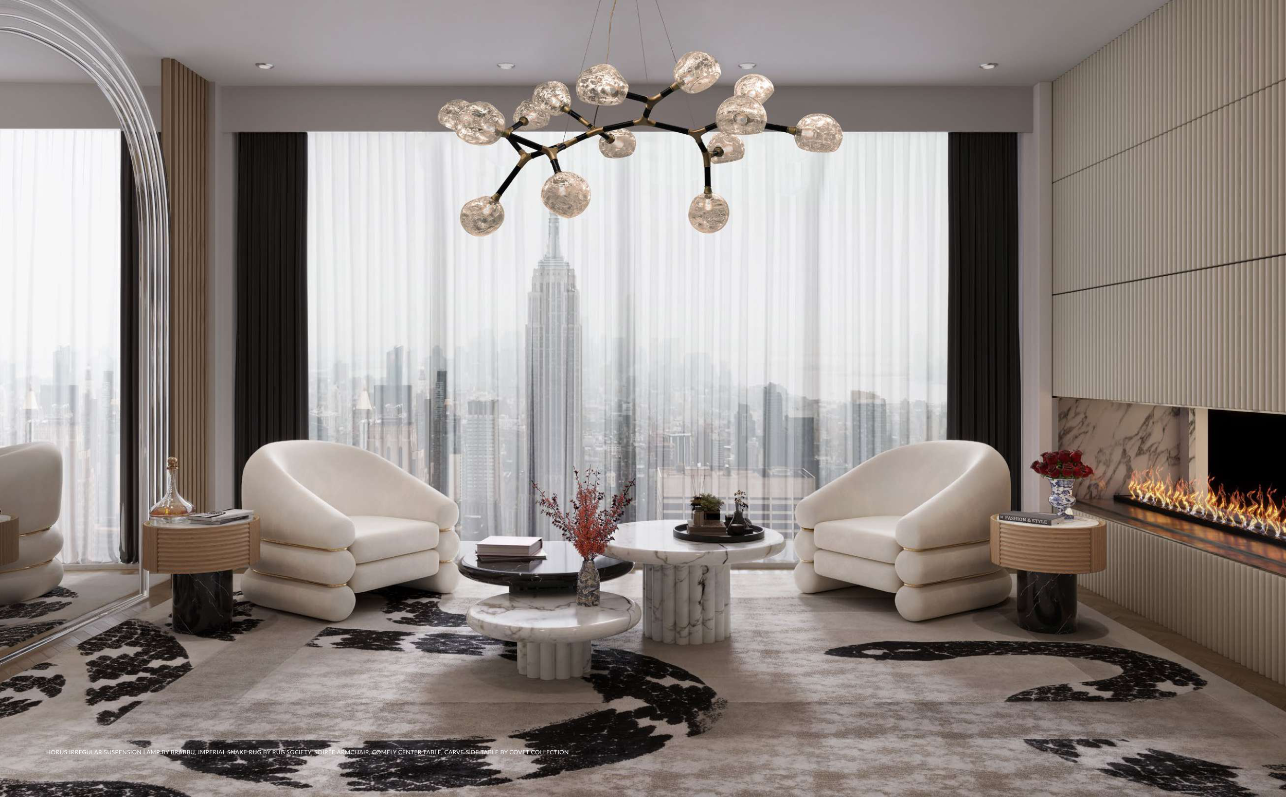 HORUS IRREGULAR SUSPENSION LAMP BY BRABBU, IMPERIAL SNAKE RUG BY RUG’SOCIETY, SOIRÉE ARMCHAIR, COMELY CENTER TABLE, CARVE SIDE TABLE BY COVET COLLECTION