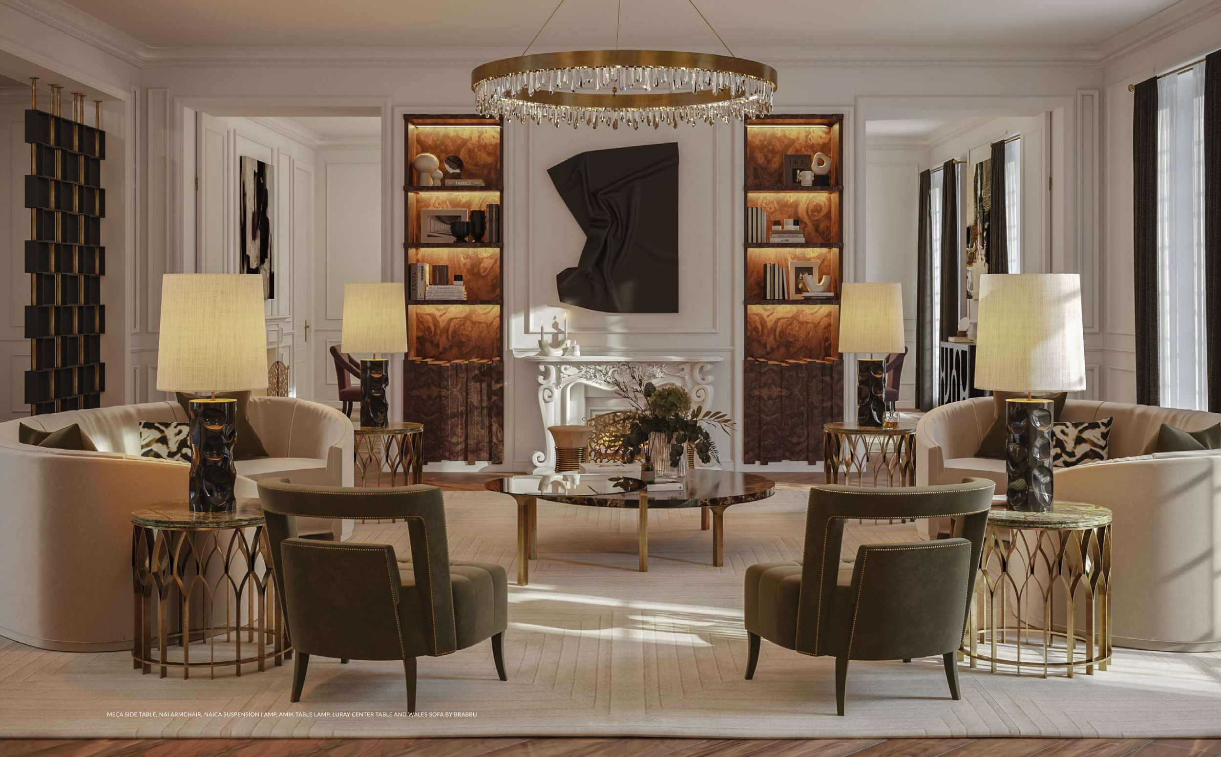MECA SIDE TABLE, NAI ARMCHAIR, NAICA SUSPENSION LAMP, AMIK TABLE LAMP, LURAY CENTER TABLE AND WALES SOFA BY BRABBU