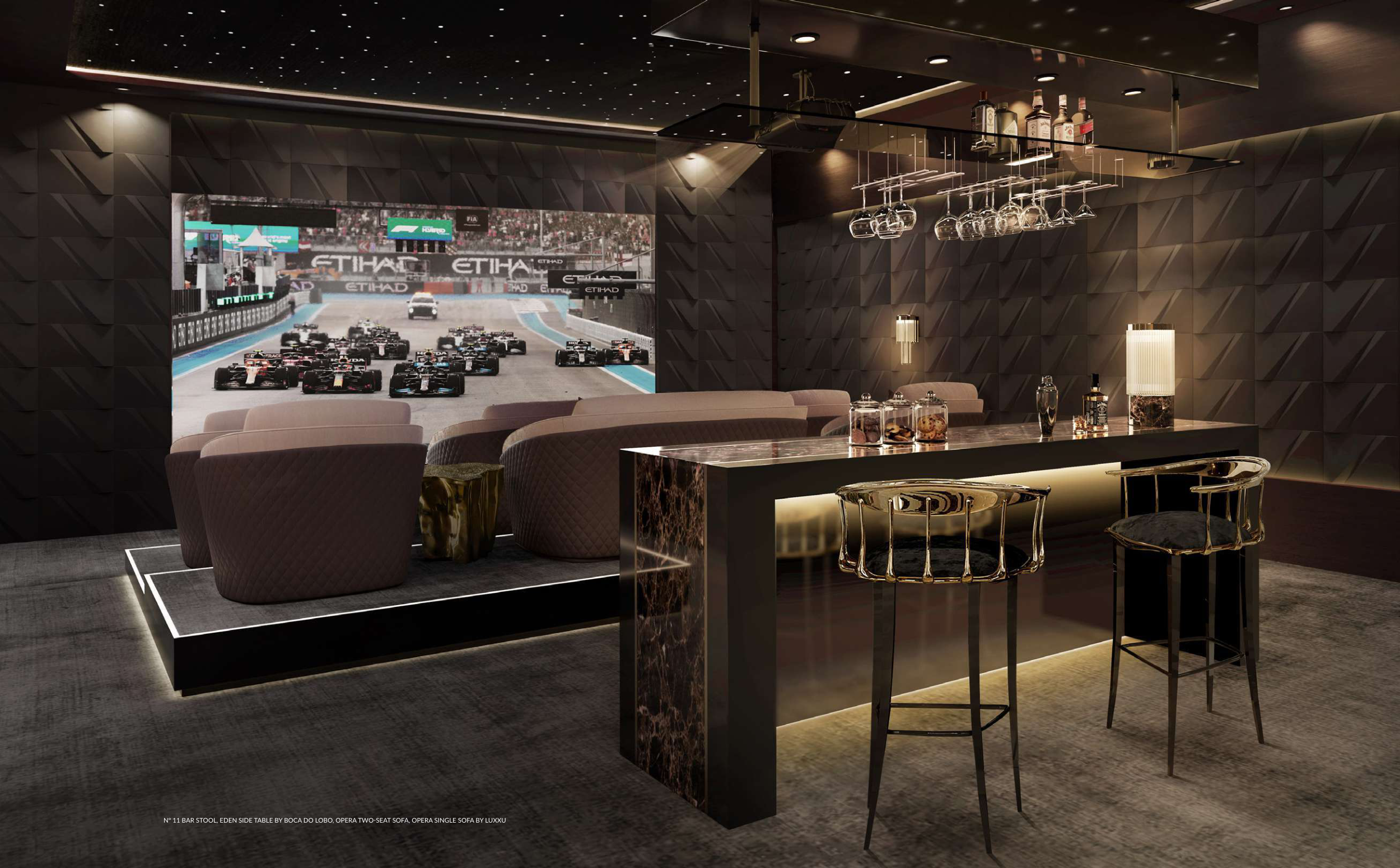 Nº 11 BAR STOOL, EDEN SIDE TABLE BY BOCA DO LOBO, OPERA TWO-SEAT SOFA, OPERA SINGLE SOFA BY LUXXU