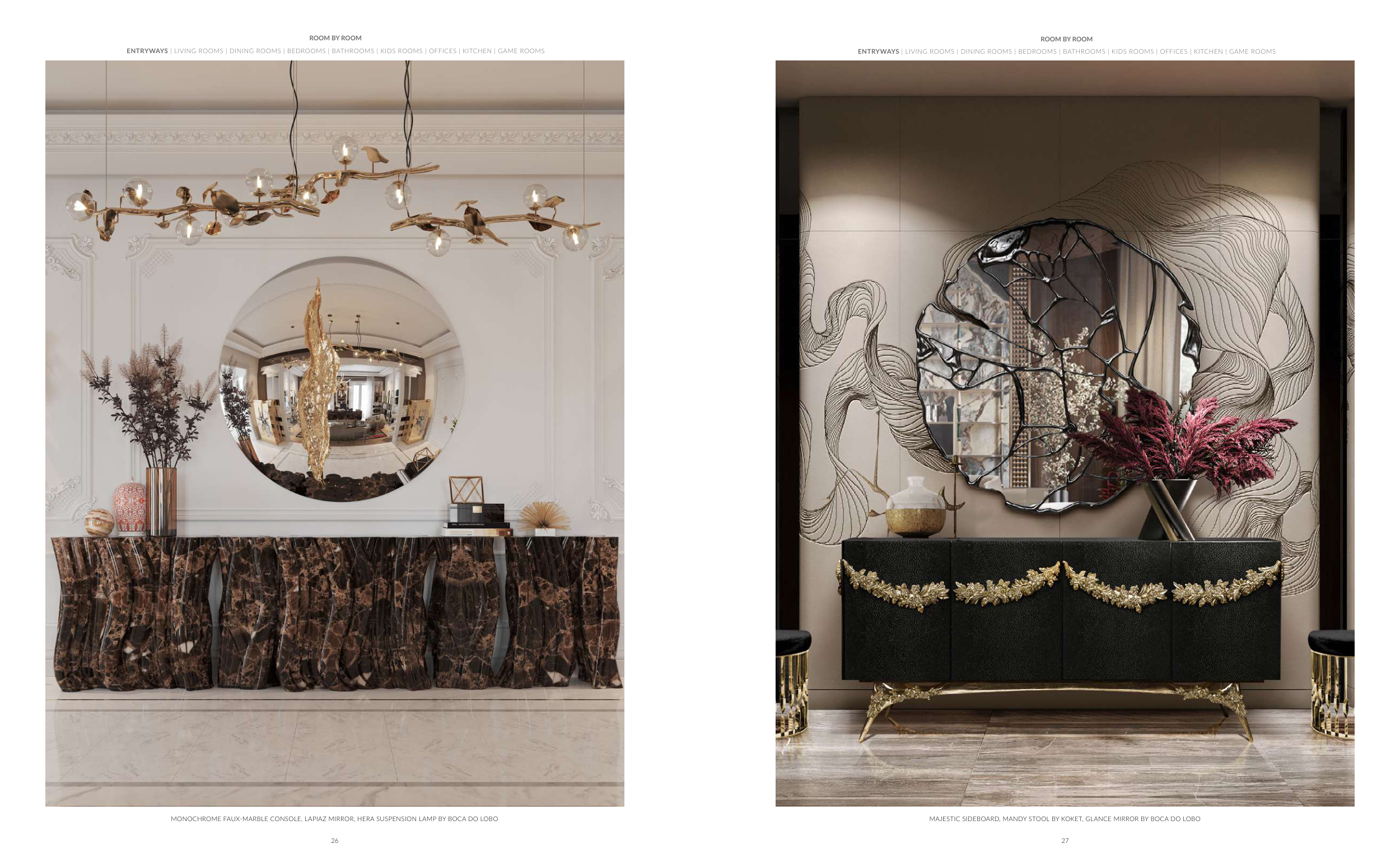 MAJESTIC SIDEBOARD, MANDY STOOL BY KOKET, GLANCE MIRROR BY BOCA DO LOBO