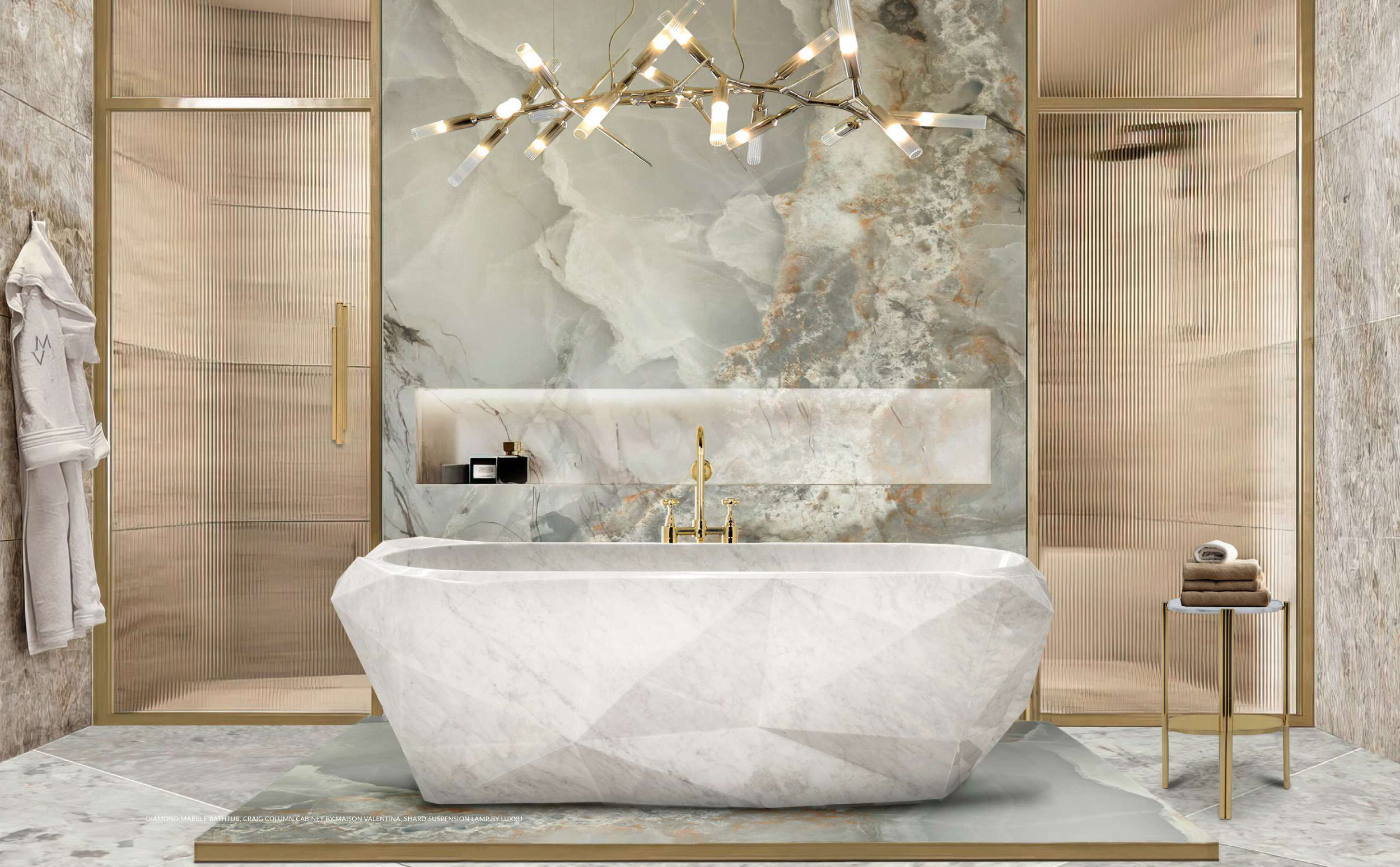 DIAMOND MARBLE BATHTUB, CRAIG COLUMN CABINET BY MAISON VALENTINA, SHARD SUSPENSION LAMP BY LUXXU
