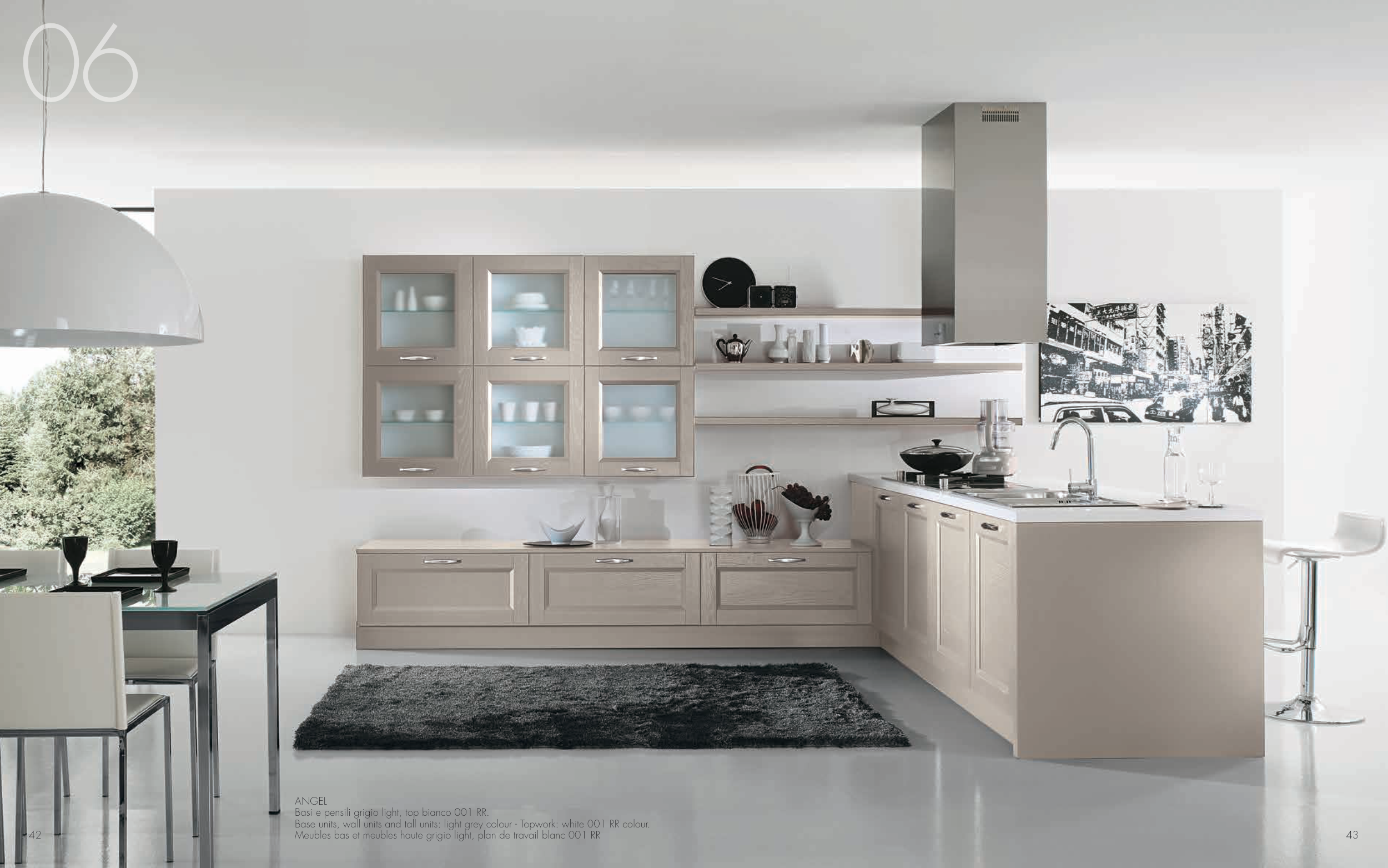 Base units, wall units and tall units: light grey colour - Topwork: white 001 RR colour.
