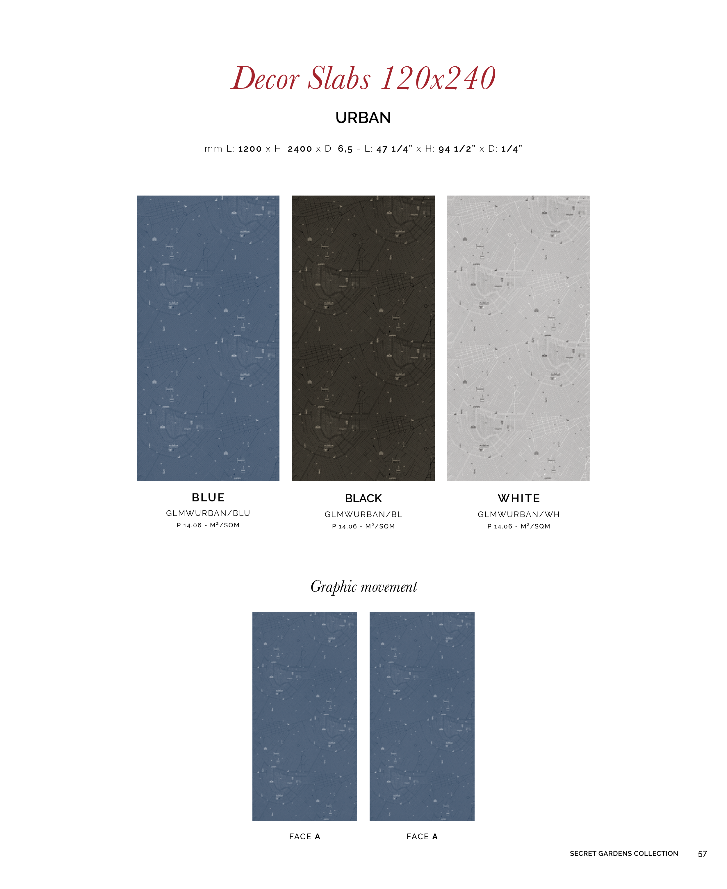 Decor Slabs 120x240 URBAN mm L: 1200 x H: 2400 x D: 6,5 - L: 47 1/4” x H: 94 1/2” x D: 1/4” BLUE GLMWURBAN/BLU P 14.06 - M²/SQM BLACK GLMWURBAN/BL P 14.06 - M²/SQM WHITE GLMWURBAN/WH P 14.06 - M²/SQM Graphic movement FACE A FACE A 57 SECRET GARDENS COLLECTION