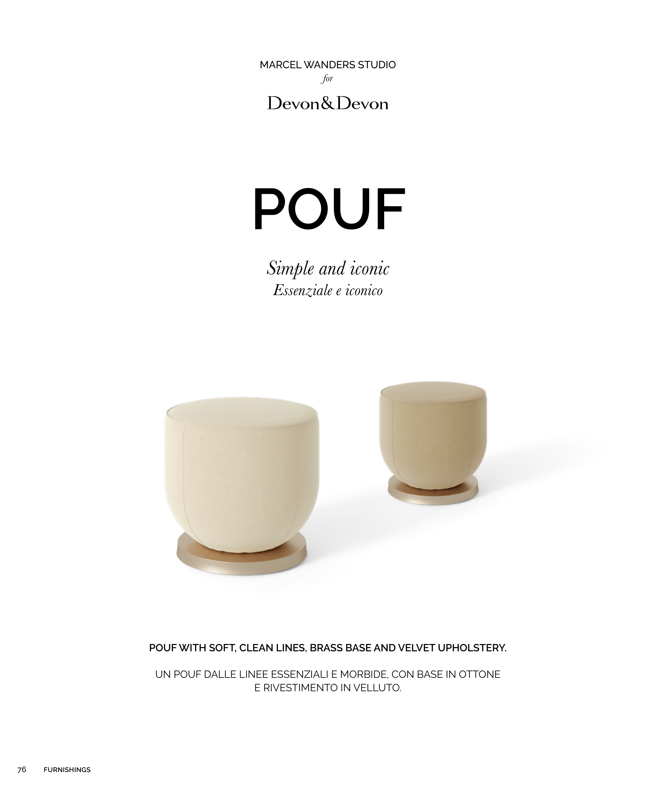 UN POUF DALLE LINEE ESSENZIALI E MORBIDE, CON BASE IN OTTONE